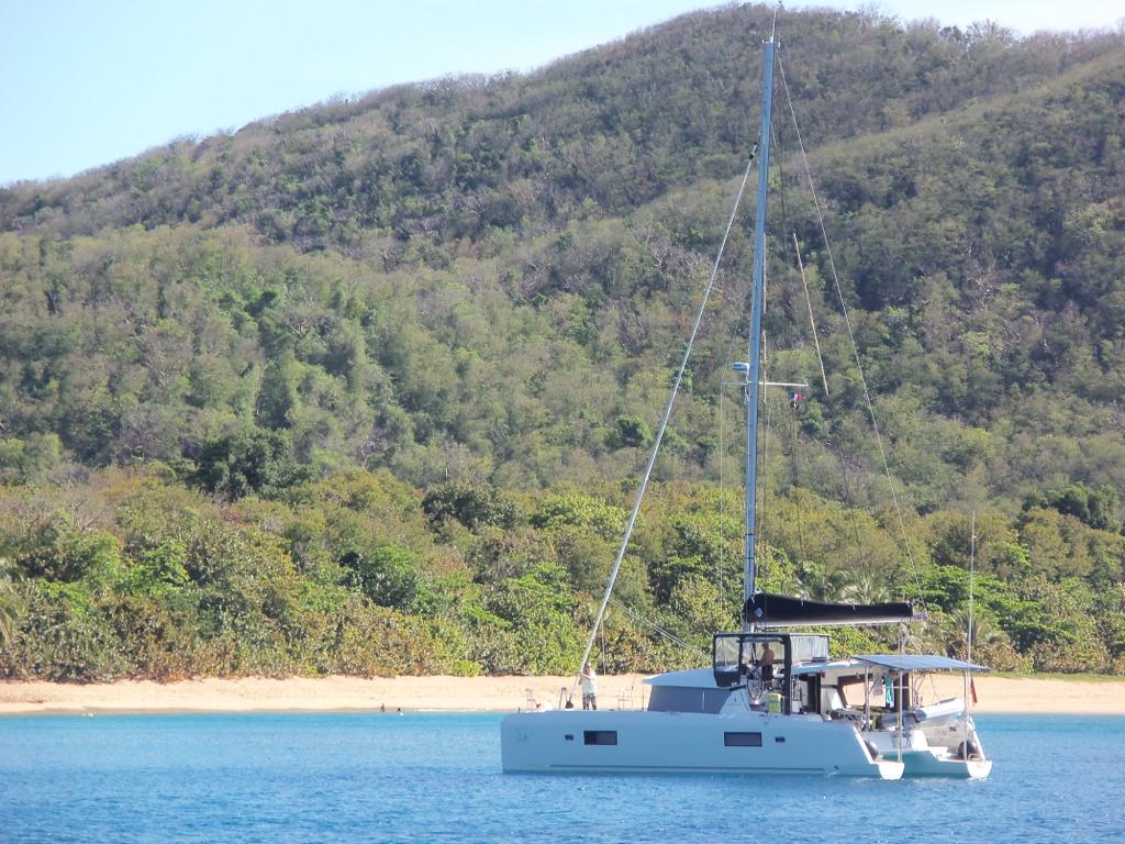 Yoshi hat sich für 4 Tage dorthin verholt und nach 4 fehlgeschlagenen Ankerversuchen vor Ort, hat er sich, wie so viele andere auch, an eine Mooring gelegt. Diese sollte 20,- €/Tag kosten, was schon recht happig ist. Also verhandelt er mit dem Geldeintreiber und kann 4 Tage für insgesamt 20,- € dort liegen! Yoshi verlegt an dem selben Tag wie wir nach Grande Anse. Gleich vorne an der Ecke, im tiefen Wasser liegt eine große alte Yacht (hat noch 2 Schornsteine, ob die allerdings noch in Gebrauch sind oder nur Deko, weiß ich nicht) unter englischer Flagge.