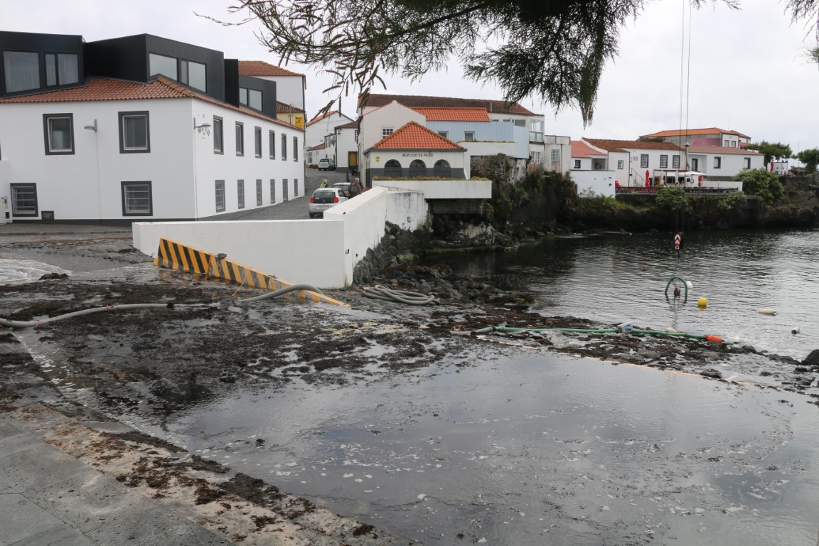 Auf Madalena angekommen, bietet sich uns an einem winzigen Seitenhafenbecken ein kleines Spektäkelchen (von Spektakel will ich mal nicht reden): eine Saugpumpe, von einem Riesen-Schwerlast-Kran gehalten, saugt Meerwasser auf, das dann durch einen dicken Schlauch auf die letzten Treppenstufen des Kirchplatzes geleitet wird. Von dort läuft es wieder ab ins Meer. Zwischen Meer und Treppen stehen dicke Betonklötze wie man sie schon mal auf Straßenabsperrungen sehen kann. Wir rätseln lange, was das wohl soll und kommen zu dem Schluss, dass die auf diese Art und Weise dieses kleine Hafenbecken von Algen befreien wollen.