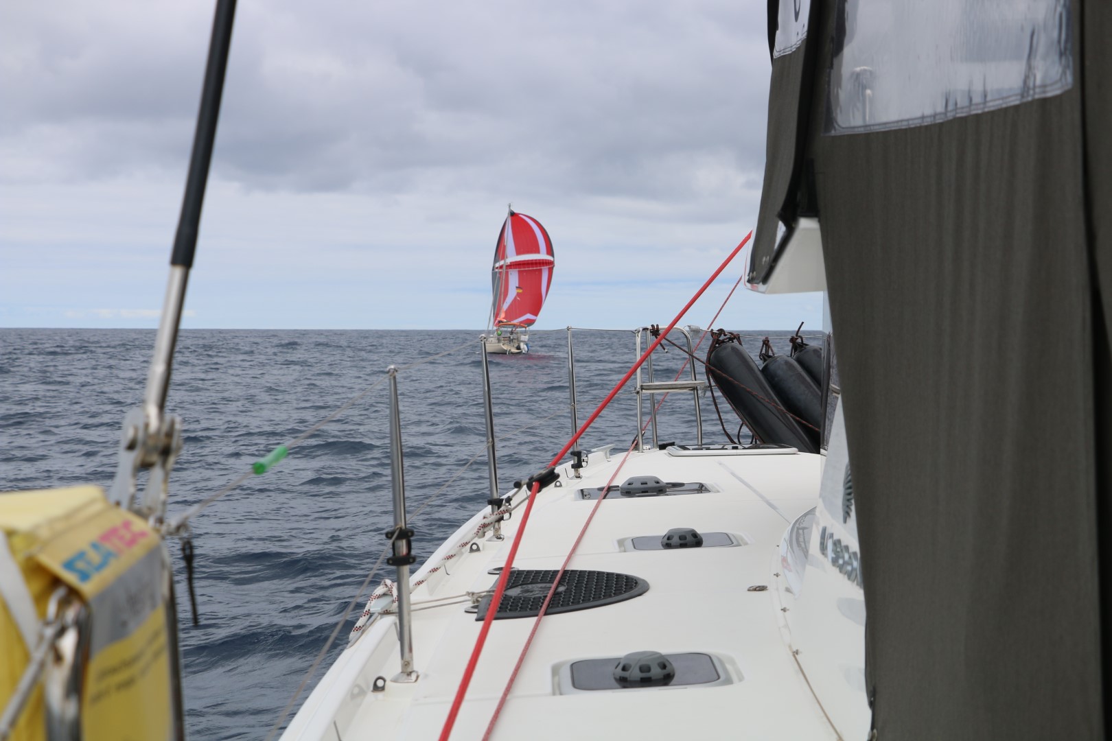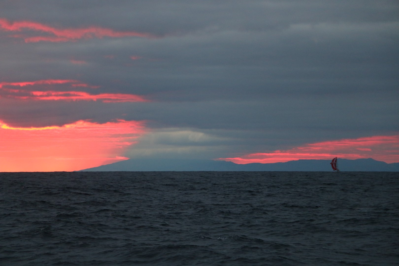 Bald zeigt sich die DaYo voraus. Yoshi hat auch seinen ParaSailor rausgezogen. Das erste Mal allein! Wir sind mächtig stolz auf ihn. Denn es könnte sein, dass er sich da von uns hat motivieren lassen. Nachteil: Wir holen nur sehr langsam auf. So dauert es 4 Stunden, bis wir in „haben“. Es setzt eine Foto-Orgie ein. Jeder will ja mal ein schönes Bild von seinem Schiffchen unter Segel haben!