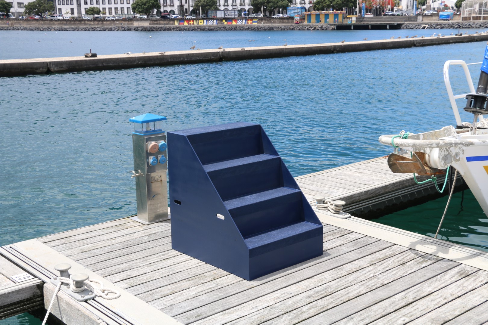 Ich war am Nachmittag schon einmal kurz in die Stadt und, ja, Ponta Delgada kann man tatsächlich mal als Stadt bezeichnen, während die anderen „Städte“ der Azoren eher größere Orte sind. Jedoch nicht mit weniger Charme ausgestattet. Nachdem ich zurück an Bord war, gab’s ein Käffchen und wir schauten uns so ein bisschen das Gewusel in der Marina an und ließen den lieben Gott einen guten Mann sein. Bis wir plötzlich ein immer lauter werdendes Klackern hörten. Neugierig reckten wir die Köpfe und sahen einen gepflegten jungen Mann mit einem Karren angefahren kommen. Er kam bis zu uns, danach ist der Steg zu Ende. Wir hatten ihn jedoch nicht bestellt und auf dem Boot gegenüber regte sich auch nichts. Hmmm, merkwürdig. Und was ist das bloß für ein komisches quadratisches blaues Teil auf dem Karren? - Na vielleicht kommt noch ein Boot längsseits und das bekommt dieses blaue Teil dann eingebaut oder nimmt es auf? Was auch immer. Es dauerte auch nicht lange, da kam auch schon ein sehr langes Einrumpfboot und legte sich direkt vor den Handkarren. Mittlerweile war noch ein zweiter Mann angekommen um zu helfen. Schien also eine etwas größere Aktion zu werden. Gespannt beobachteten wir das Anlegemanöver bei dem beide Männer halfen. Dann wurden die Fender direkt vor diesem blauen Teil zur Seite geschoben. - Aha, jetzt werden wir dann ja sehen was das bloß ist! Halleluja, Dekadenz hat einen Namen und zwar…..(hier soll jetzt eigentlich der Name des Bootes hinkommen, aber in der ganzen „Aufregung“ habe ich den vergessen zu notieren ;-)).