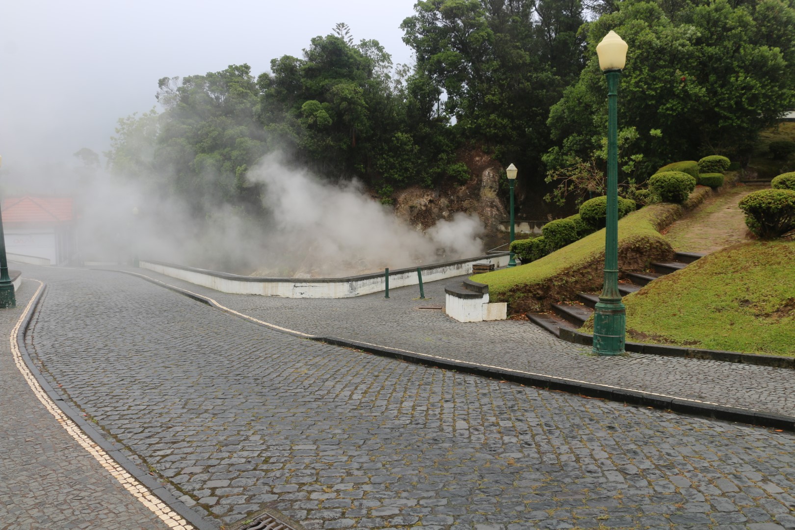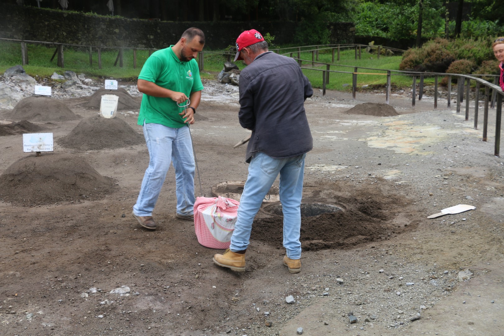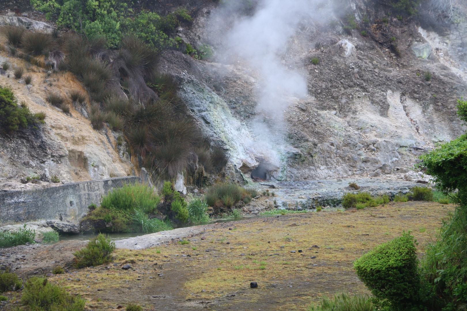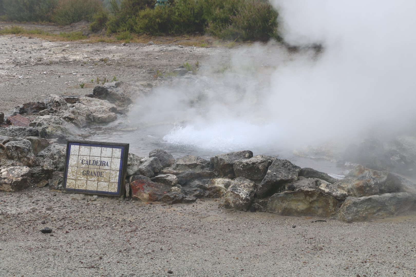 Zunächst geht es bergauf! Oh weh, denke ich – dann wird der Abstieg zum See ja noch tiefer! Und weiter bergauf. Bis wir dann vor uns den See sehen: Ja – der liegt deutlich ÜBER der Stadt! Und an seinen Hängen tritt auch wieder Dampf aus der Erde und hängt über den Hängen des Kraterrandes! Ein Viertel um den See herum und wir werden um 3 € Eintritt gebeten. Gut – nachdem Michèle sich so über die fehlende Geschäftstüchtigkeit der Kaffee-Plantagen-Betreiber beschwert hat: Hier ist man geschäftstüchtig! Wir sollen uns beeilen: Die Töpfe werden gerade ausgegraben! ???? JA – die lokal ansässigen Restaurants haben hier Löcher, in die sie Eintöpfe einstellen, die dann 24 Stunden garen und am nächsten Tag „geerntet“ werden. Gut – es handelt sich um mittlere Beton-Ringe im Boden, die durch einen Holzdeckel verschlossen und dann mit Erde bedeckt werden. Aber es ist schon interessant, Erde zur Seite, Deckel auf, Topf mit 2 Mann rausheben, neuen Topf rein, Deckel drauf, Erde rüber. Topf in eine Art Golfkarren und ab geht es zum Restaurant, wo der Inhalt zu horrendem Geld – also für azorische Verhältnisse – verkauft werden.
