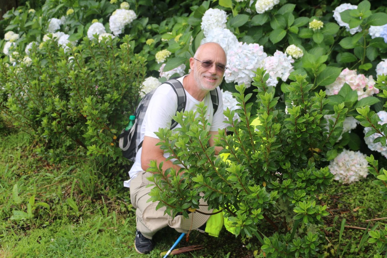 Dann kommt der zweite Teil der Runde um den See. Guter Wanderweg, doch noch einige Leute, die uns begegnen. Einige Hozskulpturen, die uns an unseren alzeyer Kettensägen-Künstler erinnern. Eine große Station von bunkerartigen Gebäuden zur Erforschung und Überwachung der vulkanischen Aktivitäten hier. Dann ein Jardin: Wieder 10 € Eintritt. Michèle schimpft nicht mehr über die Geschäftsuntüchtigkeit hier. Sondern schlägt den Verzicht vor. Die eine Hauptattraktion des Jardin können wir auch von der Straße besichtigen: Eine ziemlich verwahrloste Kirche. Die andere Attraktion, ein min 10 Meter hoher Wasserfall, muss eben ohne unser Ah! und Oh! Auskommen.