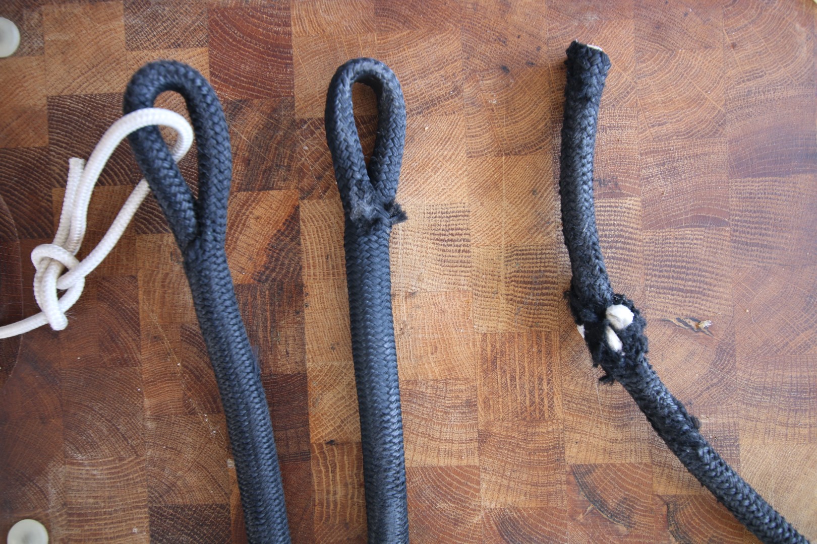 Während Michèle das zweite Mal zum Zahnarzt geht, spleisse ich ein neues Auge in das Fall. Nun weiß ich auch, warum die Experten immer sagten, Fall umdrehen. Es war mehr als mühselig, in das Ende, das nun drei Jahre immer wieder unter viel Kraft gestanden hat ein Auge zu spleissen. Natürlich erst hinterher merke ich, dass ich mir Blasen an den Händen gemolken habe. Melken nennt der Seemann das Überziehen des Mantel über das restliche Tauwerk. Anfangs dachte ich, dass das überhaupt nicht geht. Dann habe ich mir eine Markierung einen Zentimeter vom Ende gemacht und gesagt: Wenn ich den reinmelken kann, dass nehme ich das Fall. Und dann noch einen und wieder einen Zentimeter. Am Ende hatte ich dann doch den gesamten Spleiss ordnungsgemäß hin bekommen. Ok – den allerletzten Teil habe ich dann mit der Winsch gezogen. Superzufrieden wollte ich Pause machen, da kam Michèle mit Yoshi im Schlepptau an. Also ging es gleich weiter: Vernähen des Spleisses. Dicke Nadeln gingen durch das harte Tauwerk gar nicht rein. Und eine dünne Nadel habe ich dann schon beim ersten Stich abgebrochen. Also: Es wird nicht vernäht.