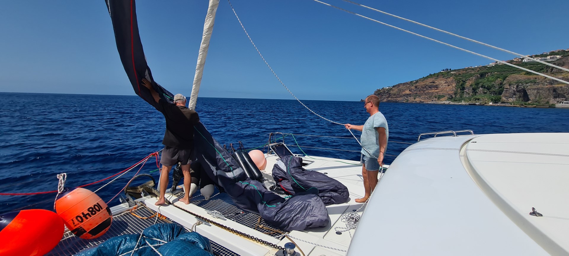 Nach einen ausgiebigen Frühstück heben wir den Anker und setzen den ParaSailor. Schöner Rückenwind treibt uns Richtung Flugplatz. Die Angel wird achtern ausgebracht. Ich mache Wasser, bereite „Ullas Linsensalat“ und das Kochstück für ein Linsenbrot vor. Dann darf ich Peter vom Sonnen hochjagen. Wir machen uns dann an die Deckenblende der Werkstatt. Peter inspiziert, was ich da habe und stellt fest, dass er die Türen besser einstellen kann. Ich segele zwischendurch immer mal wieder. Leider läßt der Wind immer weiter nach und dreht dann mit 3 kn rund um die Windrose. Da muss der Para geborgen werden. Wir versuchen es mit Groß und Fock und schummeln dann ein wenig mit dem Backbord-Motor. Als wir um die Ecke kommen steht der Wind endlich wieder gut, 6 – 7 kn lassen mich hoffen, dass es ohne Motor geht. Aber hier steht eine Welle, dass der Autopilot den Kurs nicht halten kann und so steuere ich per Hand. Melanie ist mit der Schaukelei nicht zufrieden. Aber als der Wind dann noch mehr schwächelt und wir die Segel bergen, wird es nicht besser. Auch am Ankerplatz haben wir ordentlich Schwell. Aber den hatten wir uns ja ausgesucht, damit die beiden morgen zu Fuß zum Flughafen gehen können.