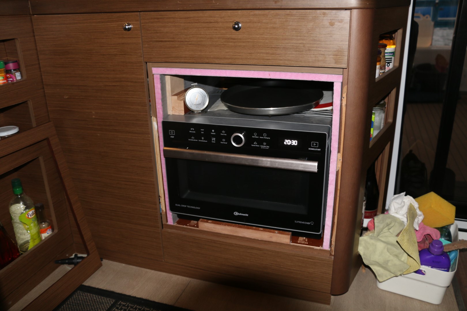 Und abends dann wird das Werk von Peter (siehe Schreinerei) nun endlich vollendet: Die Blende für den Ofen ist inzwischen auch geölt, nun wird sie an ihren Platz geklebt. Gut sieht es aus, und auch bei nahem Hinsehen sieht man nicht, dass das mit der Hand gesägt ist! Super! Danke Peter!