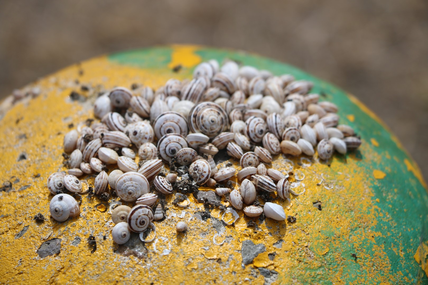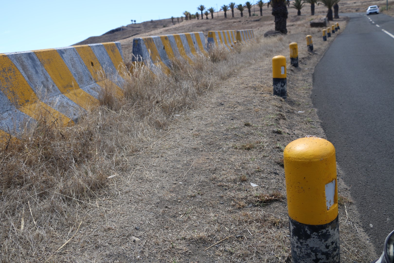 Für den Rückweg wählen wir dann den Weg über die Hügel, nicht wieder direkt zurück. Interessant: Alle Straßenpfosten sind von Schnecken besetzt. Am höchsten Punkt, mitten in der heißesten Sonne. Welchen Vorteil haben die denn nur davon? Wir sind uns einig: Erwartet hätten wir, dass die sich in den Schatten begeben.