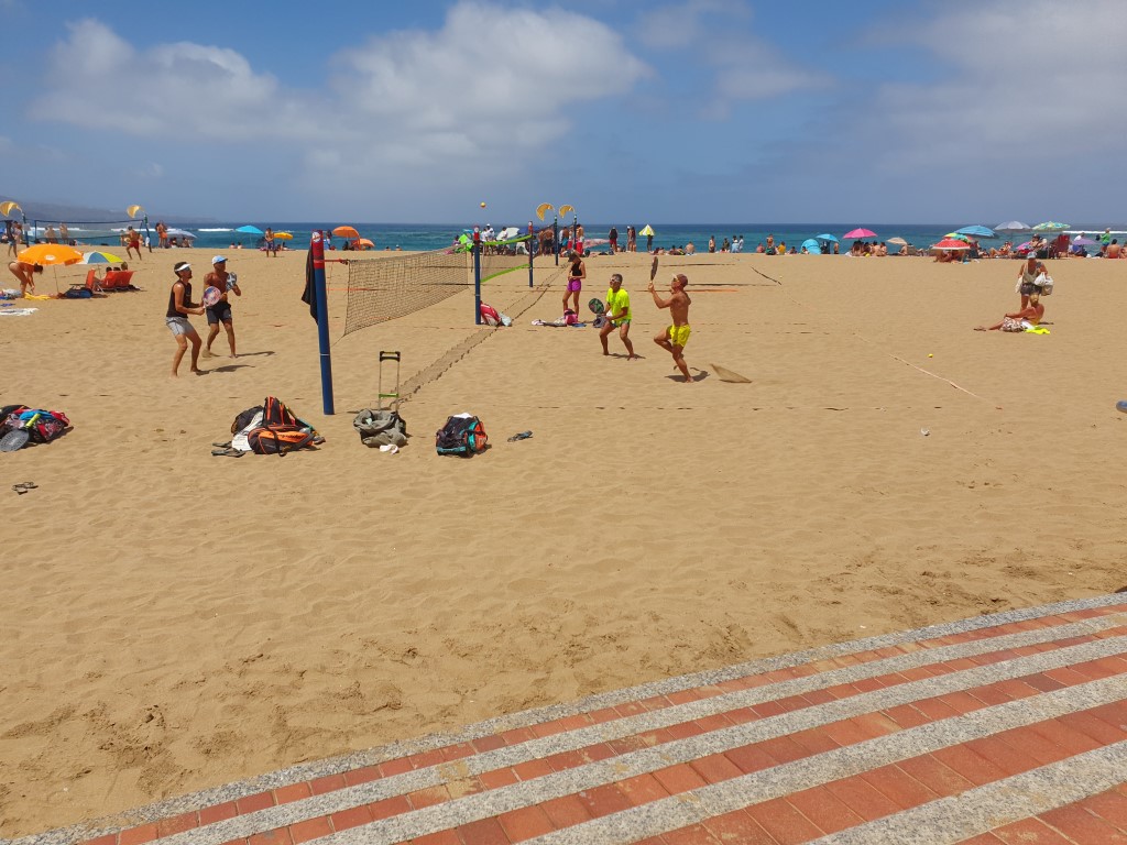 Endlich kommen die so schön instandgesetzten Fahrräder zum Einsatz! Wir fahren an den „Nordstrand Einmal durch die immer dichter werdende Menschenmenge gedrängt. Sonntag! Auf dem großen Strand ist Beach-Volleyball und Beach-Tennis angesagt. Wir setzen und auf eine Bank und schauen einer wirklich guten Paarung beim Tennis-Spiel zu. Gute Aktion!