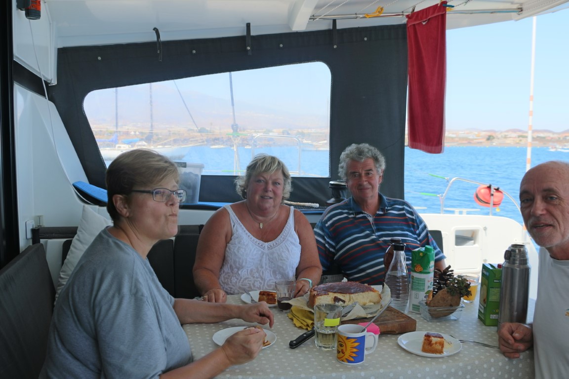 Dann geht es an Bord RE: Heut ist Donnerstag – und der aufmerksame Leser weiß – Seemannssonntag. Heute mit frischem Käsekuchen. Leider nicht ganz durchgebacken, aber schon recht braun oben. Ich bin immer noch nicht so ganz Freund mit meinem Ofen! Es wird viel geschwatzt, gelacht und geplant. Vielleicht sehen wir uns auf La Gomera oder La Palma wieder! Dann wird es Zeit für die beiden und ich bringe sie wieder an Land.