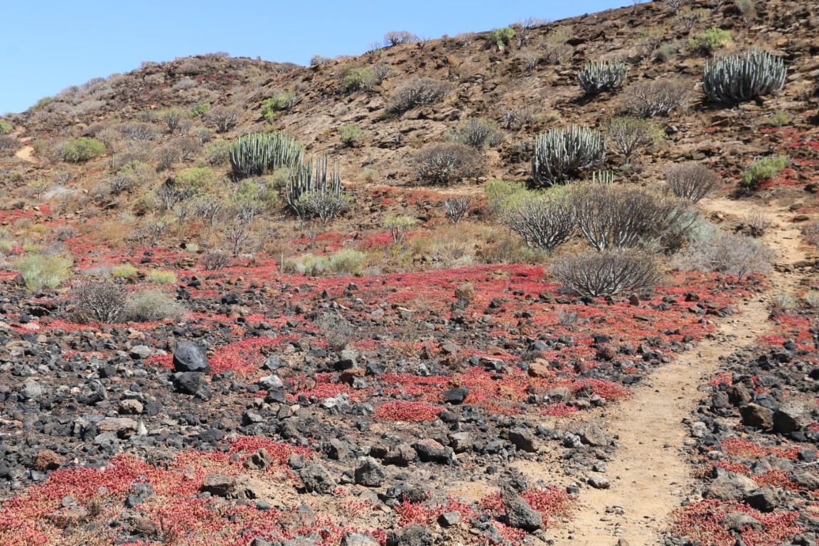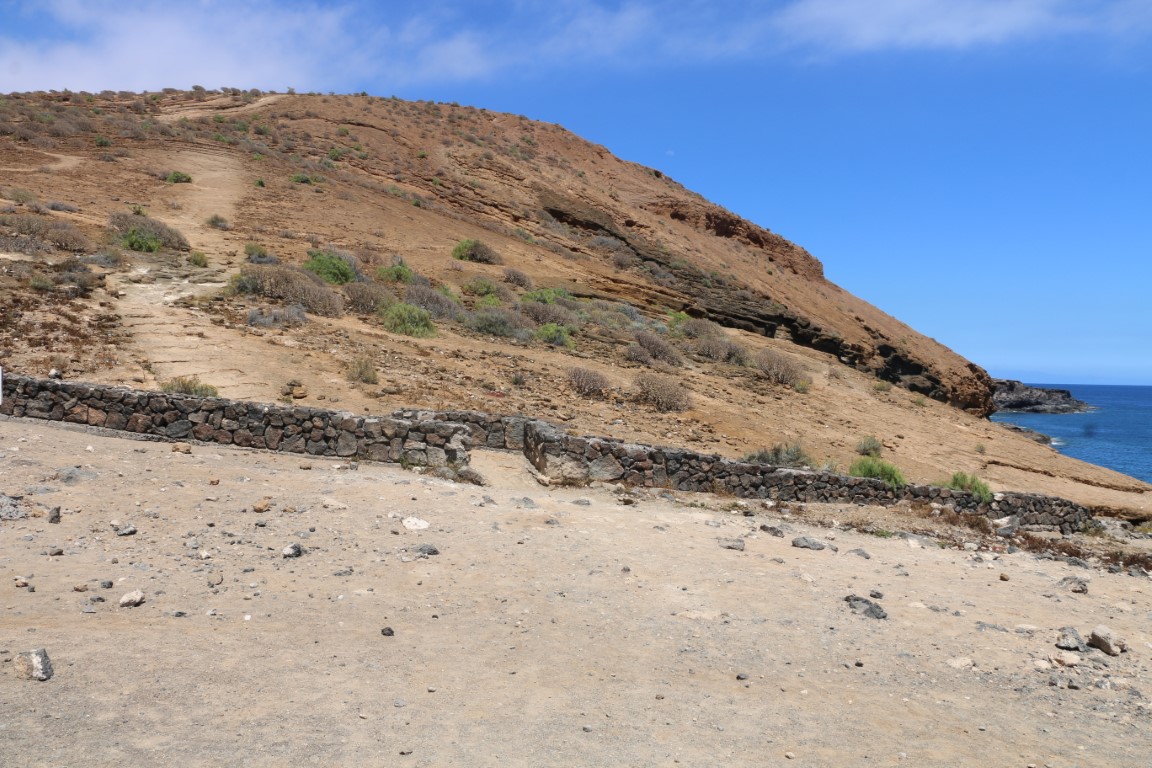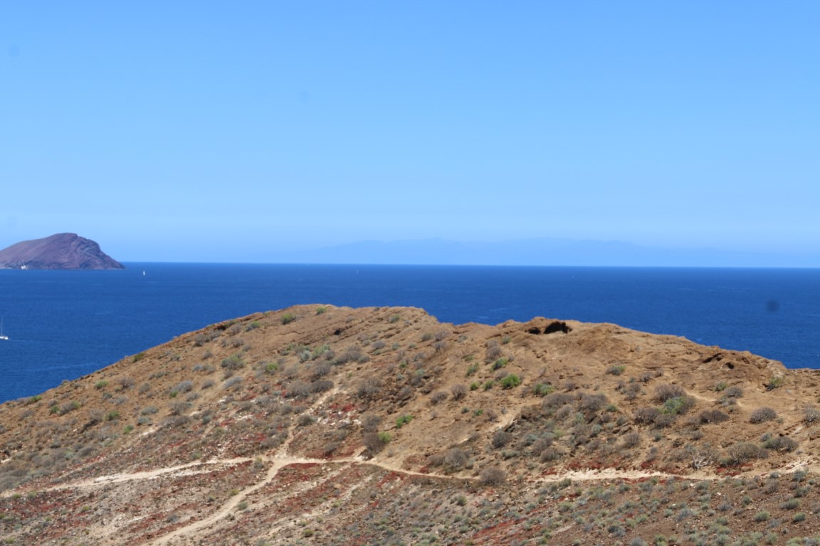 Den Nachmittag verbringen wir mit einer kleinen Wanderung. Nette Aussicht nach Norden nach San Miguel mit der Amarilla Marina. Da hatten wir im Oktober Ulrike und Thomas abgeholt. Das Monumento Natural ist nett, aber Monumento?? Wir erfreuen uns auf der „Bergspitze“ des kühlenden Windes und der ruhigen Natur: Kein anderer Wanderer unterwegs! Bis dann nach einem Fotostopp es plötzlich hinter uns patscht. Quasi aus dem Nichts taucht ein Jogger auf. Entsetzt springen wir zur Seite und machen ihm Platz. Den haben wir nicht kommen gesehen und auch nicht gehört. Und dann war er auch schon auf 2, 3 Meter ran!