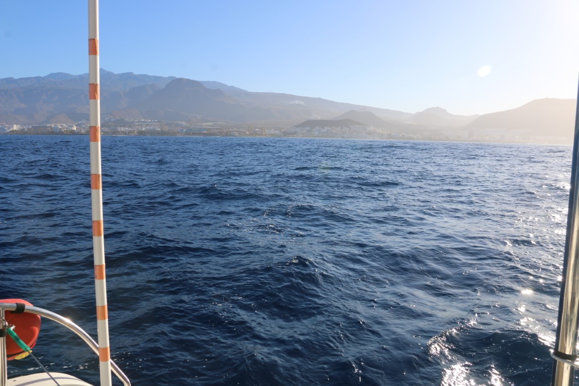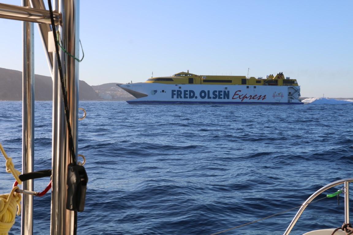 Mit einer Tasse Tee sitze ich im Steuerstand. Hier in viel befahrenem Gewässer kommt noch nicht so ganz unsere See-Ruhe-Routine auf. Die Schnellfähren zischen mit 35 Knoten durch die Gegend. Nun kommt gerade eine auf mich zu – die will nach Los Cristianos in den Hafen. CPA (closest point of approach) 17 Meter. Oh weh! Ich bin ausweichpflichtig. Aber mit meinen 3,5 Knoten bleibt da nicht viel. Aber sie kommt vierkant (direkt) auf mich zu. Also – zumindest pflichtgemäß drehe ich ab. Aber der Kapitä sieht meine Bemühungen und als guter Seemann zeigt er es mir: Er dreht um mehr als 30° ab, ich sehe plötzlich nur noch seine Backbordseite und er rauscht mehr als eine halbe Meile hinter mir durch. (Schnellbootfahrer betrachten alle anderen Boote als stehende Ziele und kurven elegant drum herum….)