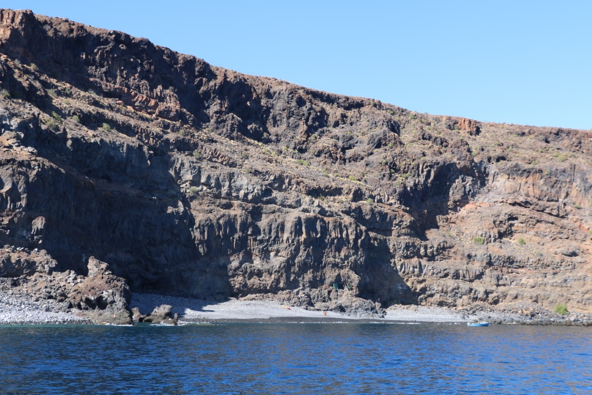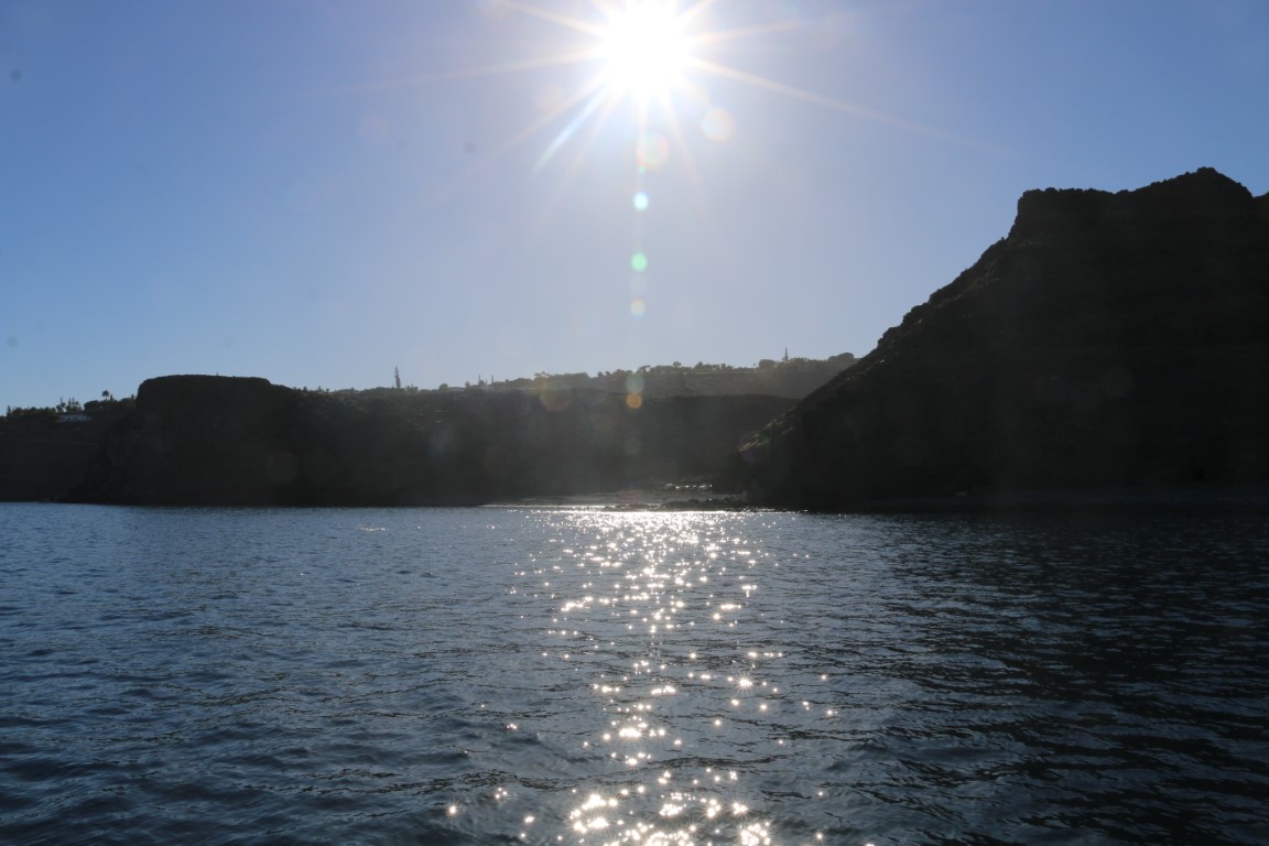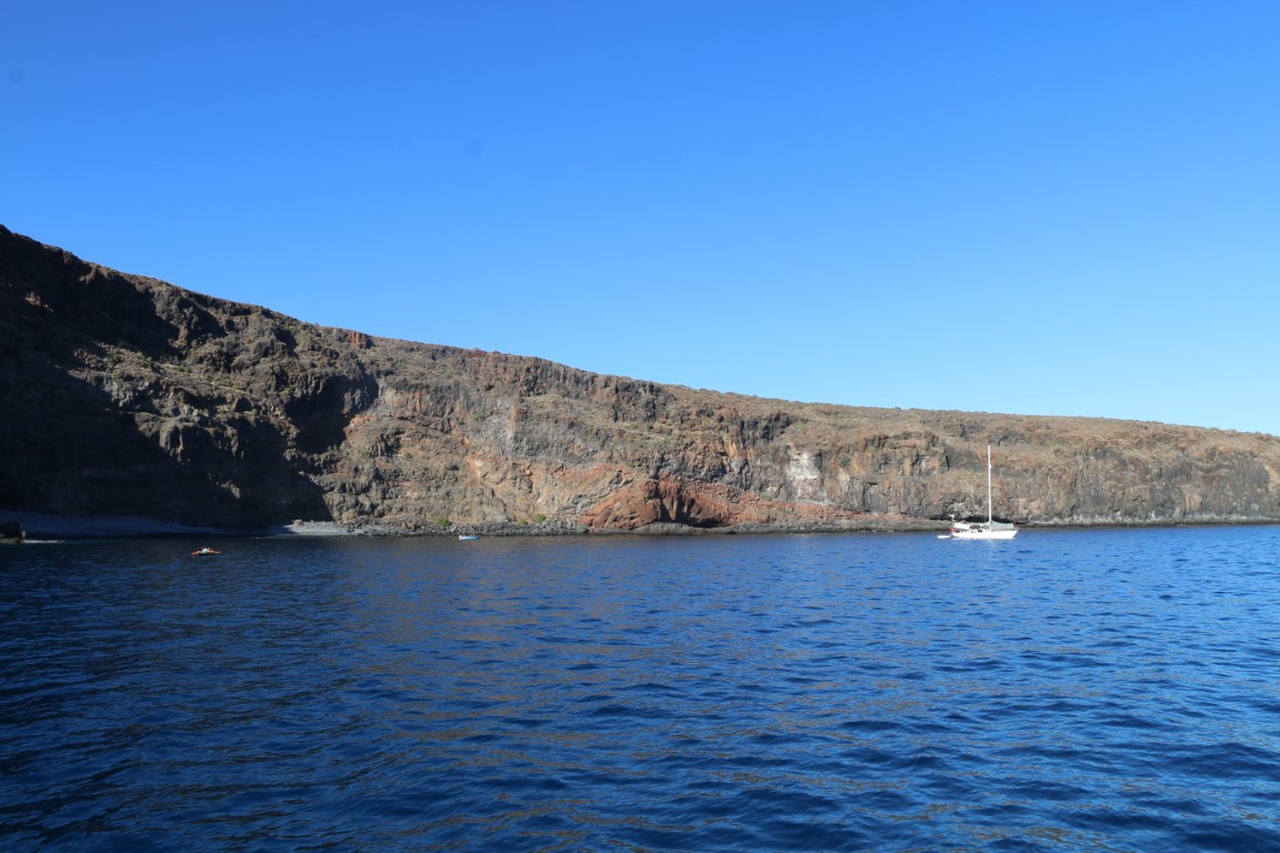 Doch auch dieses Mal währt die Freude nicht lang. Der Wind geht auf 20 Knoten zu. Und das ist die Grenze zum Reffen. Frischauf! Ans Werk. Zunächst ist das Groß dran. Reff 1. Kaum ist das Segel so weit verkleinert, haben wir auch in Spitze 22 Knoten. Gut gemacht! Es wird ein bisschen „hackelig“. Hoch am Wind und gegen die Welle. Das rumst manches Mal. Dann kommen wir in die Abdeckung von La Gomera. War die große Frage: Fällt der Wind von der Insel runter und hat noch mehr Geschwindigkeit? Oder schattet die Insel ab? Nun – jetzt wissen wir es. Der Wind nimmt ab. Und noch weiter ab. Ausreffen. Und bald auch: Motor an. Michèle hat die wunderbare Idee: Schau mal da – das sieht nach einer schönen Bucht aus! Es sind drei! Wir nehmen die westlichste, verspricht mir da ein größerer Vorsprung doch gute Deckung. Und so werfen wir gegen 15 Uhr den Anker und es herrscht Freiden um uns herum. Baden auch zur Ankerkontrolle. Ein Schnorchelgang am Ufer entlang. Massen von recht kleinen Fischchen, die ich hinterher als Dicklippen-Meeräsche identifiziere. Wieder ein Hurra: Hatte ich mir doch ein kleines Identifikations-Büchlein geleistet! Zur Nacht hin wird es noch ruhiger. Das ist auch mal sehr schön!