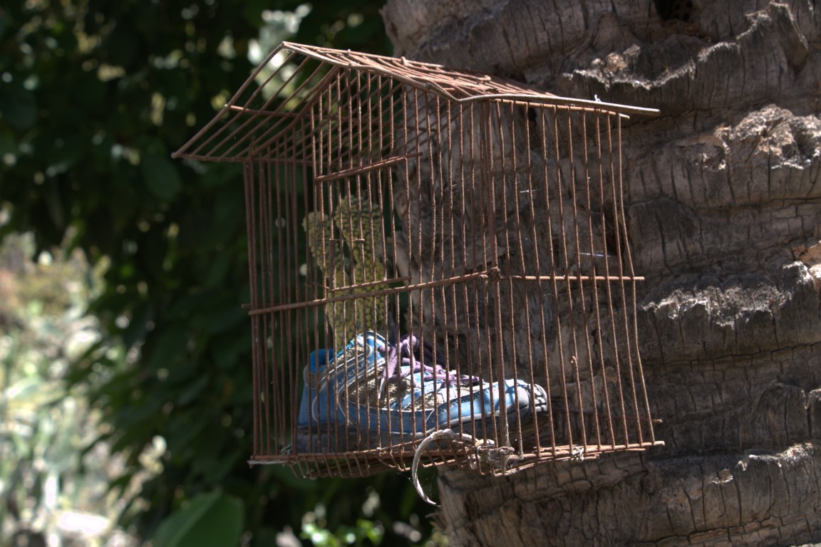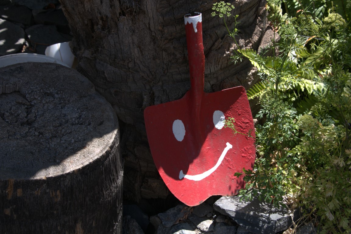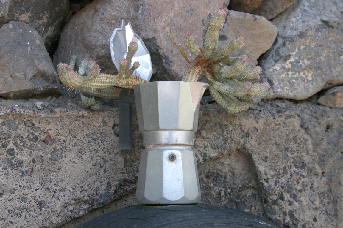 Kurz vor Ende der Teerstraße dann eine „Kunstausstellung“. Nett gemacht. Ist das nun auch schon upcycling? Wenn man Müll nett anmalt, dekoriert oder anders verwertet? Am meisten interessiert mich die Frage, ob die Vögel die „Schuh-Nester“ auch benutzen??? Zumindest eine Reihe von Fotos ist uns das wert.