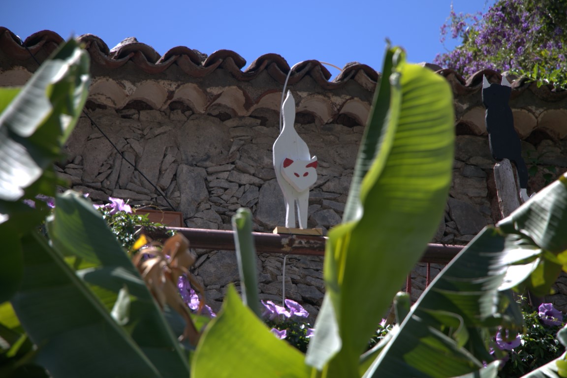 Gleich bei der „Kunstausstellung“ führt ein Pfad quer zu dem offiziellen Rückweg. So bekommen wir noch ein kleines Stück davon mit. Dann kommt die Abzweigung und wir sind wieder auf unserem Hinweg. Runter eine Teerstraße, das ist einfacher. Teils erreichen wir – trotz Katze streicheln – einen Schnitt von mehr als 5 km/h. Trotzdem sind wir in Santiago zufrieden, uns bei „Don Tomato“ nieder zu lassen. Ich bekomme einen prima Sangria und Melone mit Serrano-Schinken, Michèle ist da mit Cafe und Wasser etwas traditioneller. Und zurück an Bord verkündet der Admiral: Nix Restaurant, Essen an Bord heute Abend!