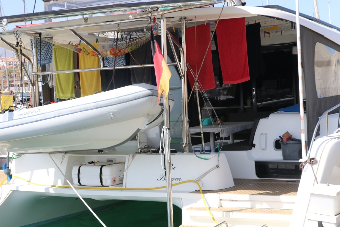 Beim Ankern haben wir uns ne Menge Staub gefangen, schon auf der Hinfahrt nach Gomera Salz dazu, das war eine schöne Schicht. Gestern bei der Abfahrt hatte ich die Seewasser-Waschanlage fertig gemacht. Ich hatte Befürchtungen, dass der Anker ne Menge Dreck mit hochbringt. Nun – dann habe ich schon mal viel Staub abgespritzt. Und heute nun alles mit Frischwasser. Die Fenster sogar geledert. Das Schlauchboot total gereinigt. Und auf der Terrasse merke ich dann an: Das nächste Mal im Hafen gibt es wieder eine Kärcher-Reinigung. Die dauert immer besonders lange. Denn wenn man nur ein Flecken an Oberdeck kärchert, dann sieht man das, was man bis eben noch als Weiß gesehen hat mit ganz anderen Augen…. Aber auf der Backskiste unter dem Steuerstand und im Eingang zum Salon sind Spuren, die mit bürsten nicht mehr abgehen….