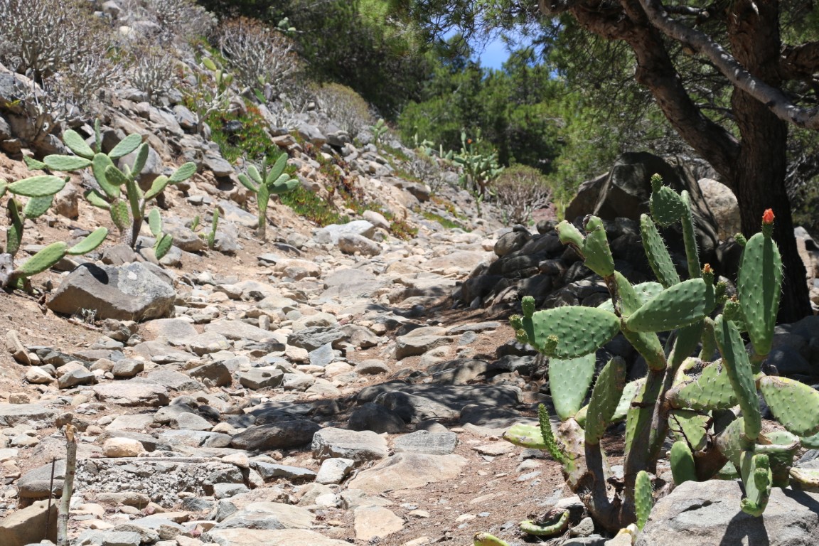 Schon auf dem Abmarsch großes Treffen: Erst Herry, der gerade Müll wegbringt. Dann auf der langen Gerade Renèe und Hans. Und dann Peter mit seinem Mitsegler. Jedes Mal wird ein Schwätzchen gehalten. Alle abgearbeitet. Dann geht es nach rechts in die Steigung. Teile des Weges kennen wir noch aus der ersten Besteigung des Pico Castello vor über einem Jahr. Doch hier und da gibt Komoot einige Wanderwege „querfeldein“ vor. Da verlassen wir die Straße.