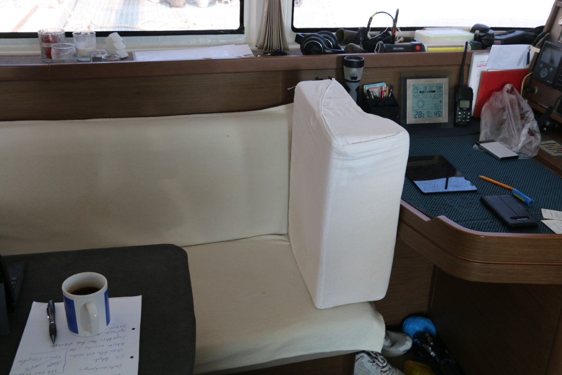 Neben dem Sonnenschutz habe ich noch ein anderes „Näh-Projekt“. Im Salon steht schon seit Langem eine variable Rückenlehne. Einfach in ein ehemaligen Kopfkissenbezug gestopft. Der soll nun „in Form“ gebracht werden. Lösung A: Zur Näherin bringen, die hatte schon die Lehne für die Maststütze so schön gemacht. Oder Lösung B: Selbst machen. Ich entscheide mich für …..