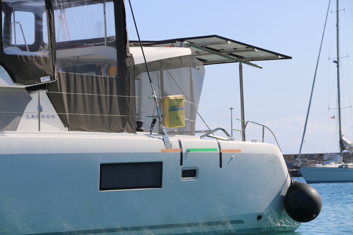 Das ist Soltis 86. Gut zu beziehen über NauticStore24.at. Reflektiert 86% der Sonnenenergie. Das merkt man richitg. Wir haben das seit Bremen schon um die Fenster in Salon. Prima! Man kann immer noch recht gut rausschauen. Man kann wenig bis gar nicht reinschauen. Und es hält den Salon deutlich kühler!