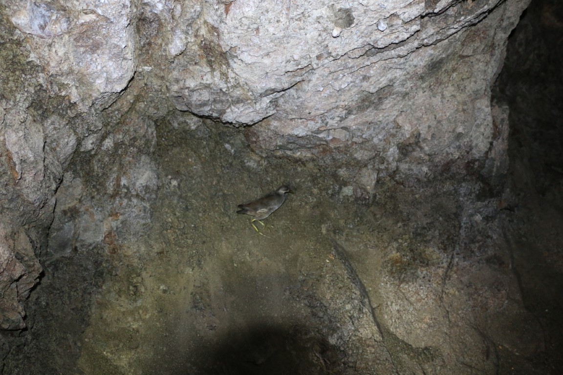 Schon nach den ersten Metern das erste große „Huch“: Ein kleines Hühnchen (?) betrachtet den Tunnel wohl als Stall. Nicht viel weiter der erste Frosch! Wenig Spinnen und Motten. Nach einer kaum wahrnehmbaren Biegung machen wir alle unsere Lampen aus. Stockdunkel! Nicht ganz – zurück blickend sehen wir zwei rote Flecken! Meine Vermutung, Widerschein des Einganges bewahrheiteten sich nicht. Aber was es nun wirklich war, konnten wir nicht heraus finden.