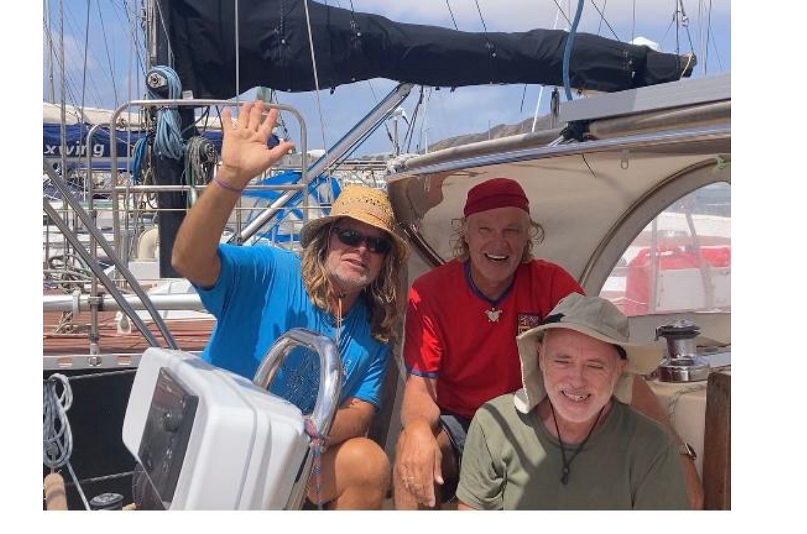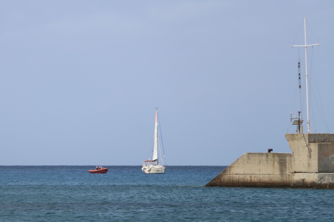 Vor mir prescht die GNR Yoshi entgegen. Ich hatte ihn über Funk schon gewarnt, die Flagge „Q“ bereit zu halten. Die bedeutet: Ich bitte um Erlaubnis einzulaufen, an Bord ist alles wohl. Und so nebenbei: Ich habe mich noch nicht einklariert. Heute sind „gnädige“ GNRler in dem Schlauchboot und mit dem Hinweis, dass er nachmittags zum Einklarieren ins Büro kommt, lassen sie ihn dann zufrieden. Nun bin ich dran – längsseits gehen und aufentern. Im Heckbereich schleppt er ein Board mit. Aber darüber denke ich nicht viel nach. Vor dem Bord bedeutet er mir, soll ich festmachen und hoch kommen. An Deck will ich Yoshi begrüßen. Doch – das ist Fred von der GUANCHA. Der ist Yoshi entgegengepaddelt und von ihm stammt das Board! Super – nun sind wir zu dritt, da ist das Hafenmanöver dann ein Kinderspiel.