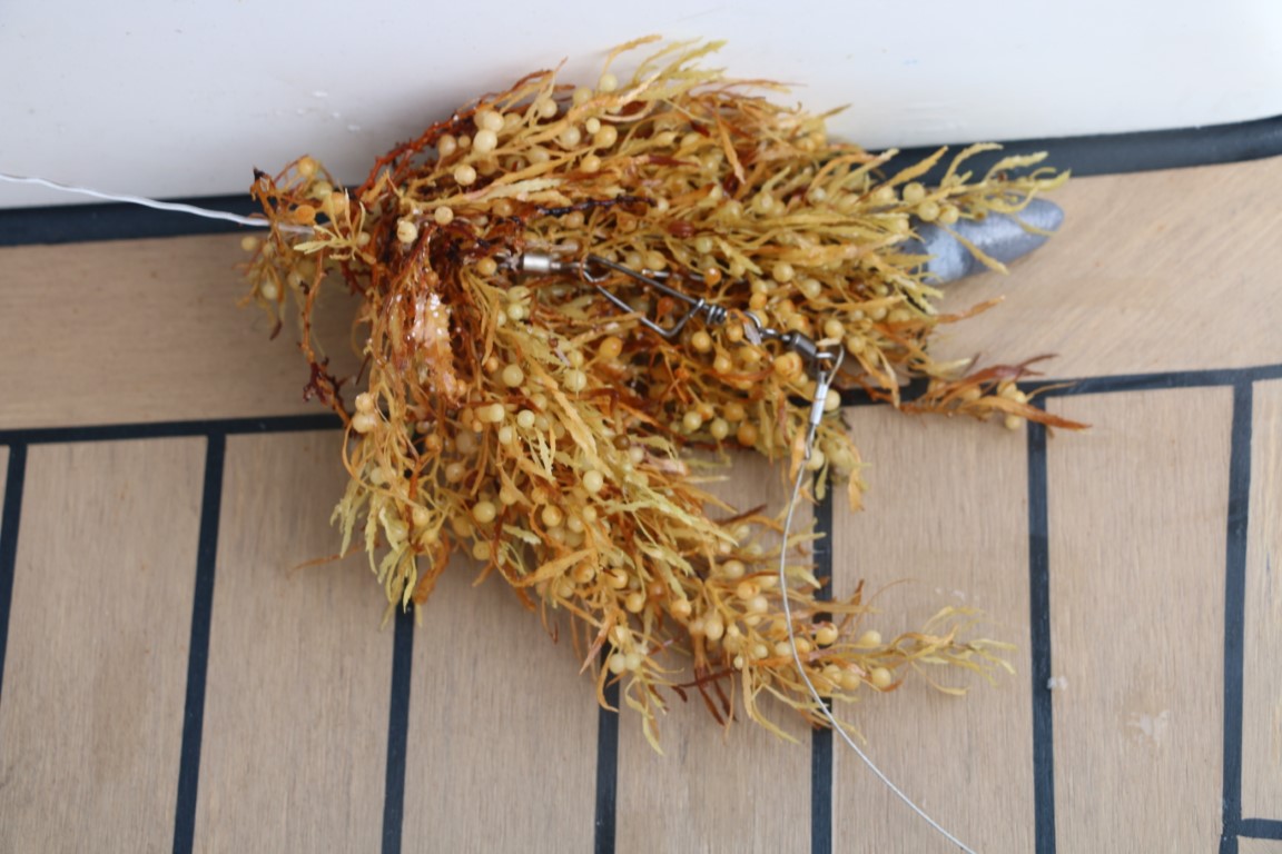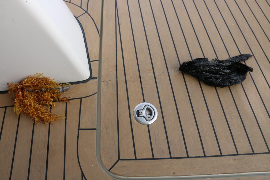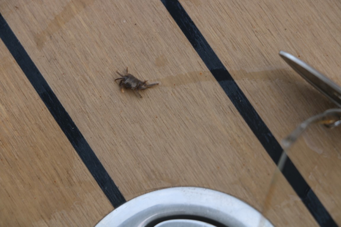 Dann einmal die Angelleine einholen: Etwas schwerer, als nur der Köder. Aber zu leicht für einen Fisch! An Deck dann „the catch of the day“: Sargassokraut und Plastik. Die beiden Probleme des Atlantiks! Und wie jeder gute Fischer habe ich auch „Beifang“. Dem kleinen Kerl rate ich, es doch lieber weiterhin im Wasser zu versuchen. An Bord RE schätze ich seine Überlebenswahrscheinlichkeit als klein ein. Die richtige Sprache finde ich mit einer Pütz Wasser… Und wünsche ihm ein schönes Leben! Tschüss!