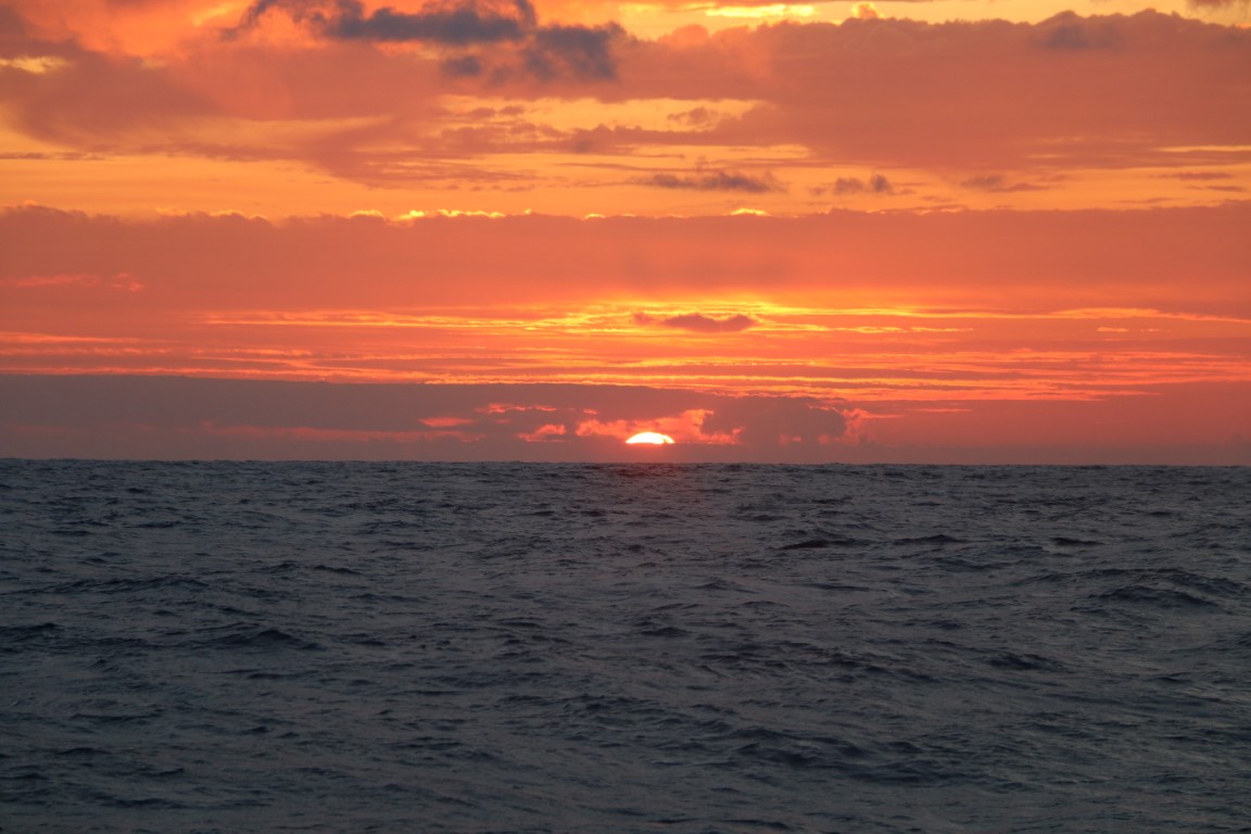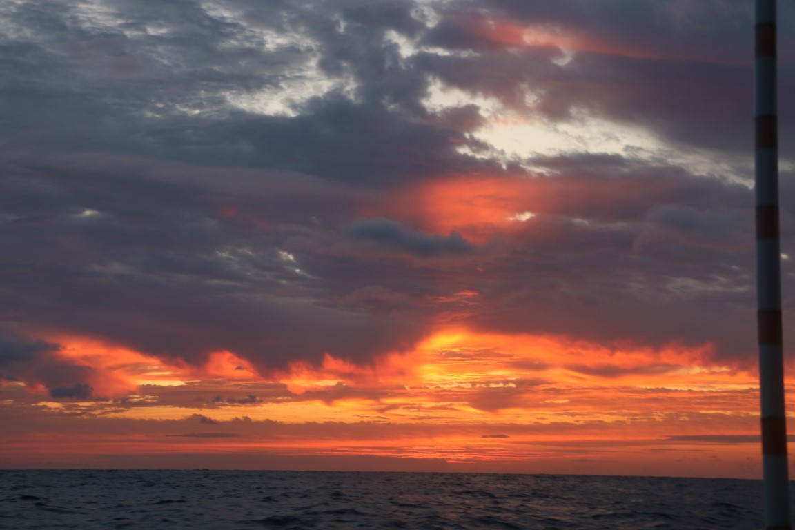 Auch trägt der Segelfortschritt zum Wohlbefinden bei: Habe ich doch seit Abfahrt für mich stets ein Ticken besseren Wind als vorhergesagt. Und ich hab mir schon die „schöne“ Vorhersage vom ECMWF-Modell genommen. Ok – das mit dem „Segeln“ auf dem Autopilot trägt auch deutlich bei. Aber statt Flaute hatten wir noch segelbare 8 – 9 Knoten Wind, die Phase mit dem etwas stärkeren Wind war gerade so, dass Reff 1 richtig war. Und die Richtung ist immer ein Ticken weiter nach Nord oder Ost, als vorhergesagt und damit sehr gut für mich! Sonntags Mittag stehe ich noch 160 Meilen von Santa Maria entfernt. Das bringt mich in die Schwierigkeit, dass ich eher zu früh, nämlich im Dunklen ankommen würde. Aber das beginne ich erst morgen früh durchzurechnen. Vor mir soll noch eine Flautenzone kommen. Passt, denn ich will ja 50 Meilen motoren, um die beiden Maschinen einmal „durchzublasen“.