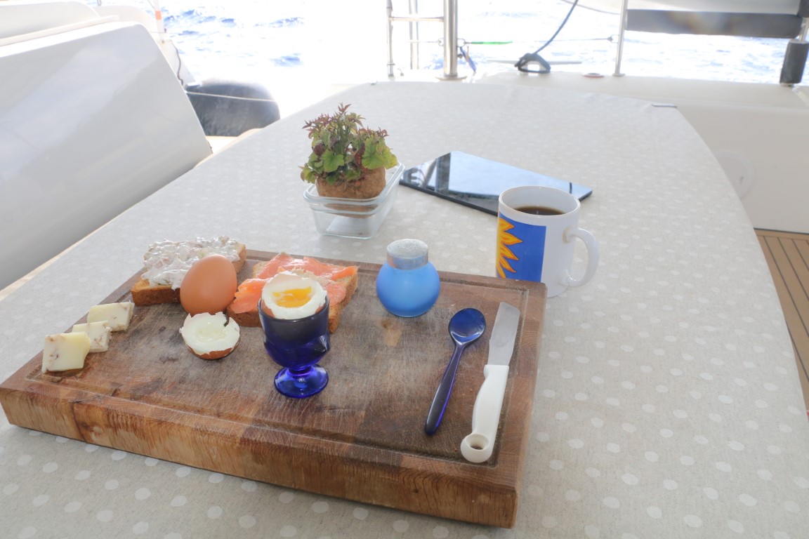Eine wunderbar ereignislose Nacht liegt hinter mir. Und somit bin ich um 6 Uhr (fast) ausgeschlafen. Dann die übliche Morgenbeschäftigung: Per Kurzwellenfunk die neuesten Wetterdaten holen, Tee trinken: Die regelmäßigen Leserinnen wissen, dass ich Übertragungsgeschwindigkeiten runter bis zu 100 Byte pro Minute (ja! Minute, also 1,6 byte pro Sekunde) habe. Dann bricht die Landstation ab. Schon gestern Abend hatte ich phantastische 5.000 bis fast 8.000 byte pro Minute. So ein Wetterdatensatz für 3 Tage und 100 Meilen voraus umfasst ca. 10.000 Byte. Ich habe gerne 2 Modelle, im Zweifelsfalle morgens ECMWF und abends GFS. Aber auch heute morgen lade ich mir beide runter. Dauer: Weniger als eine halbe Stunde. Deswegen: Tee trinken. Dann Morgengymnastik. Ob man das nun Qui-Gong, oder Yoga light oder kleine Rückenschule nennt, Hauptsache, einmal den Körper durcharbeiten. Mein Freund Ralf und natürlich auch Bettina haben das Startsignal gesetzt. Ja – es ist mit fortschreitendem Alter nötig! Dann umfasst die Sonntagsmorgen-Toilette auch noch rasieren. Ein toller Sonnenaufgang muss fotografiert werden, die Wetterdaten sind nun da und müssen begutachtet werden. Mit ein paar anderen Kleinarbeiten ist es – schwupps – 9 Uhr. Nun – irgendwie bin ich noch ein wenig müde, der Horizont auch elektronisch frei – das gibt noch mal eine Schlummerstunde! Eher etwas mehr. Und wie ich wieder ganz wach bin bemerke ich ein kleines Hüngerchen! Ja, das hat es morgens lange nicht mehr gegeben! Das wird heute sonntags-gemäß zelebriert: 2 weiche Eier, Lachstoast, Fleischsalat-Toast, ein paar Eckchen Trüffel-Ziegenkäse. Serviert wird es auf der Terrasse. Dazu spielt das London Symphony Orchestra Rock-Balladen. Das Wasser rauscht am Heckspiegel, die Sonne blinzelt herein. Merkt man an der Beschreibung, dass es ein richtig herrlicher Sonntagsbrunch wird?!!