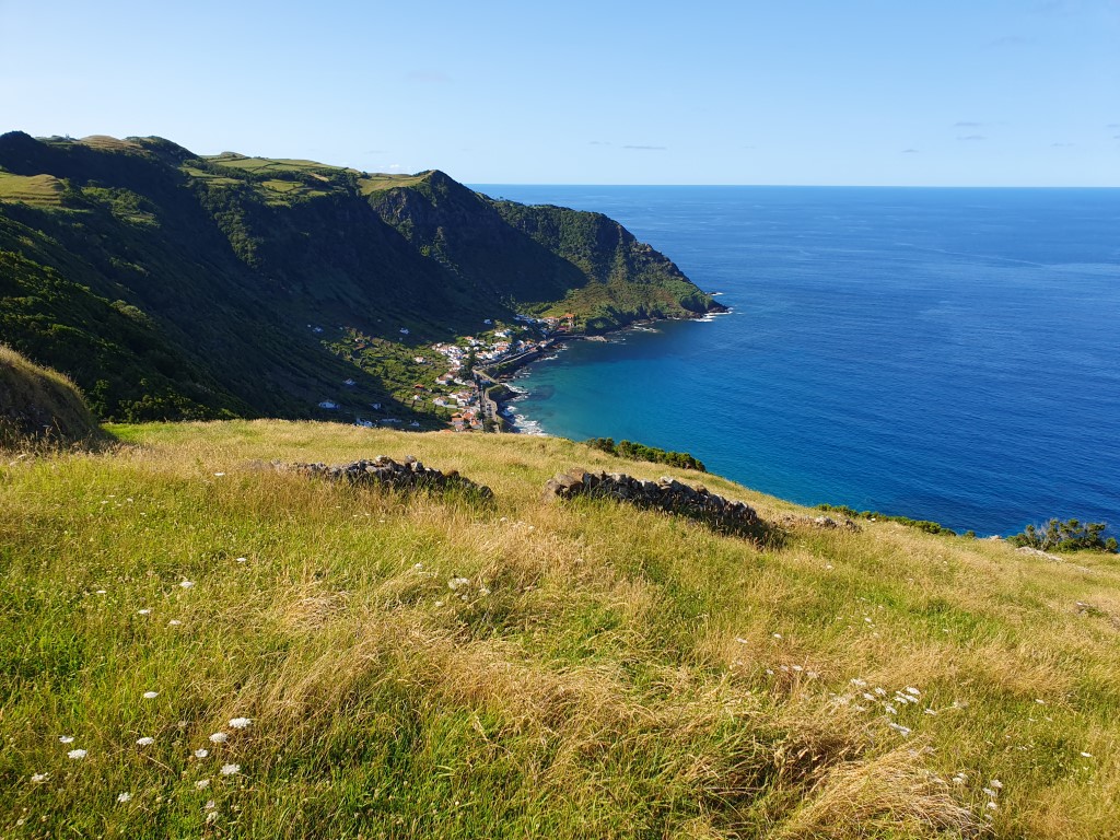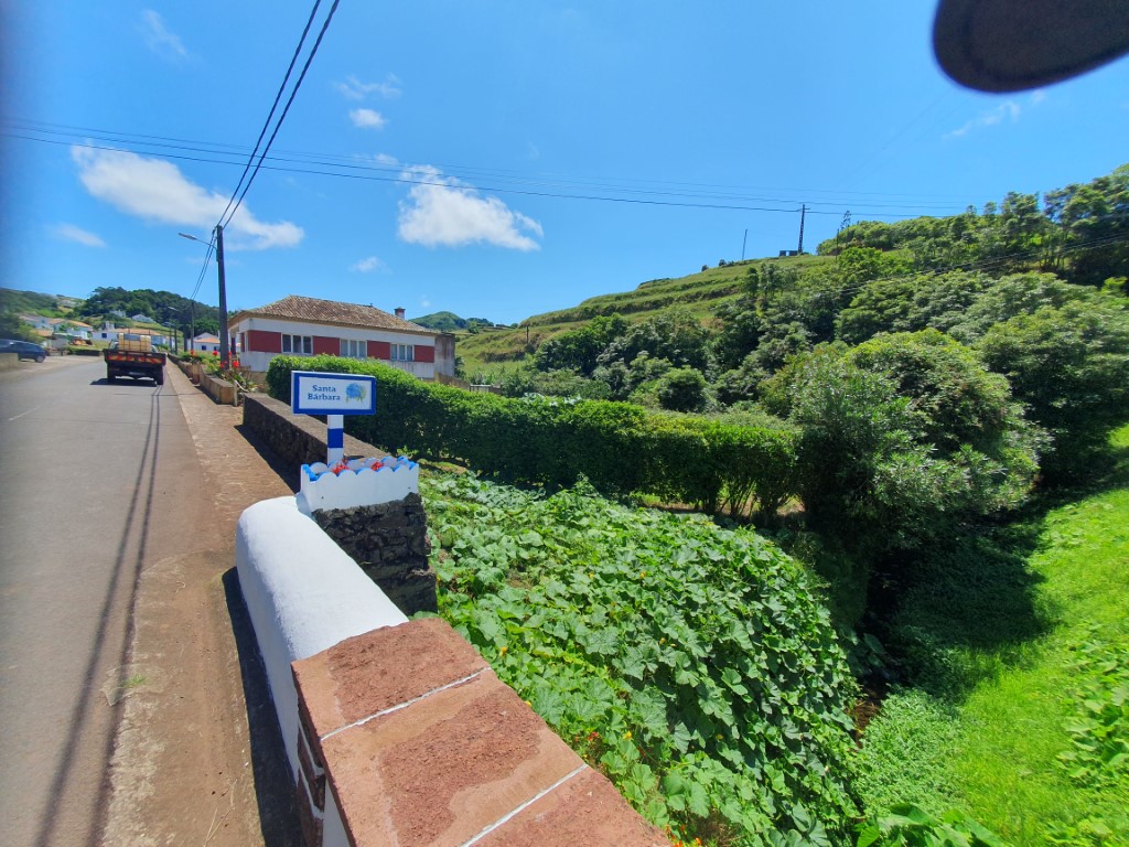 So machte ich mich gegen 13.30 Uhr auf, um um 15 Uhr da zu sein. Hat auf die Minute geklappt. Die beiden haben sich ein nettes Häuschen im Hügel gekauft. Helga liebt Santa Maria. Und das zeigt sich auch auf unserer kurzen Wanderung. Mich „erinnert“ die Insel an Irland. Da war ich ja noch nie, aber so stelle ich es mir vor. Hügelig, klein, nett. Wobei es hier wahrscheinlich viel netter warm ist….