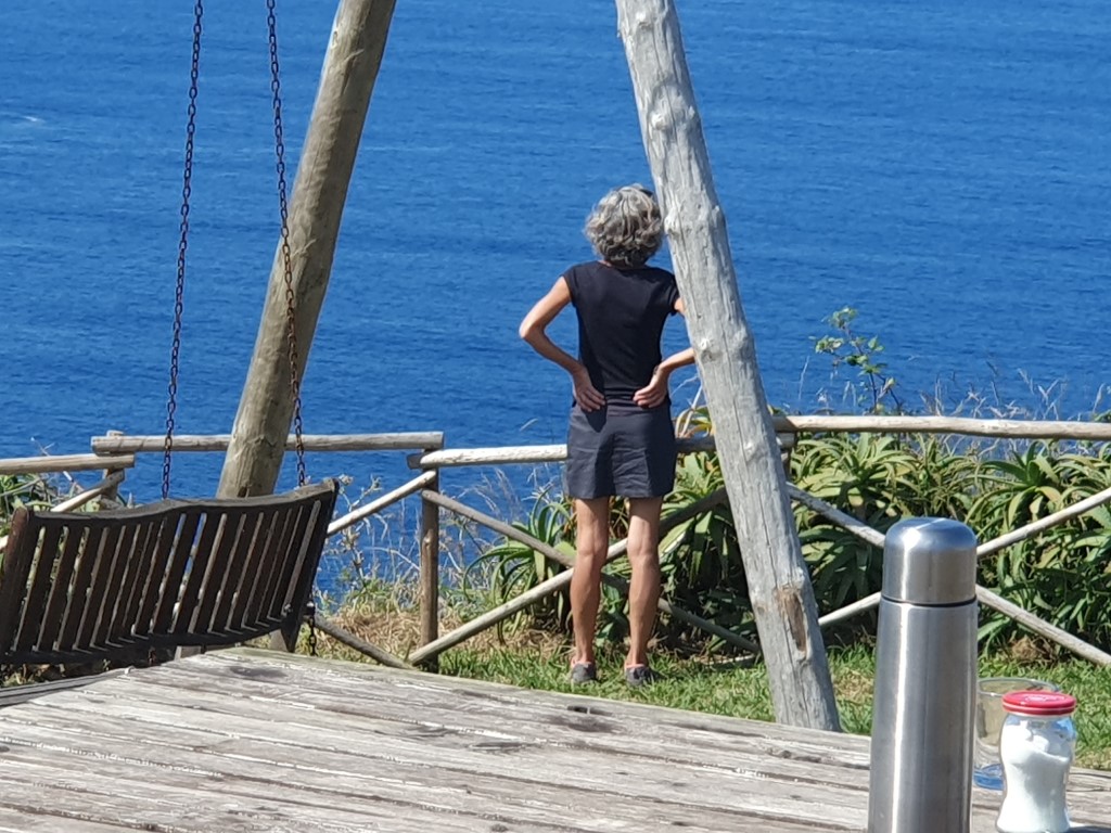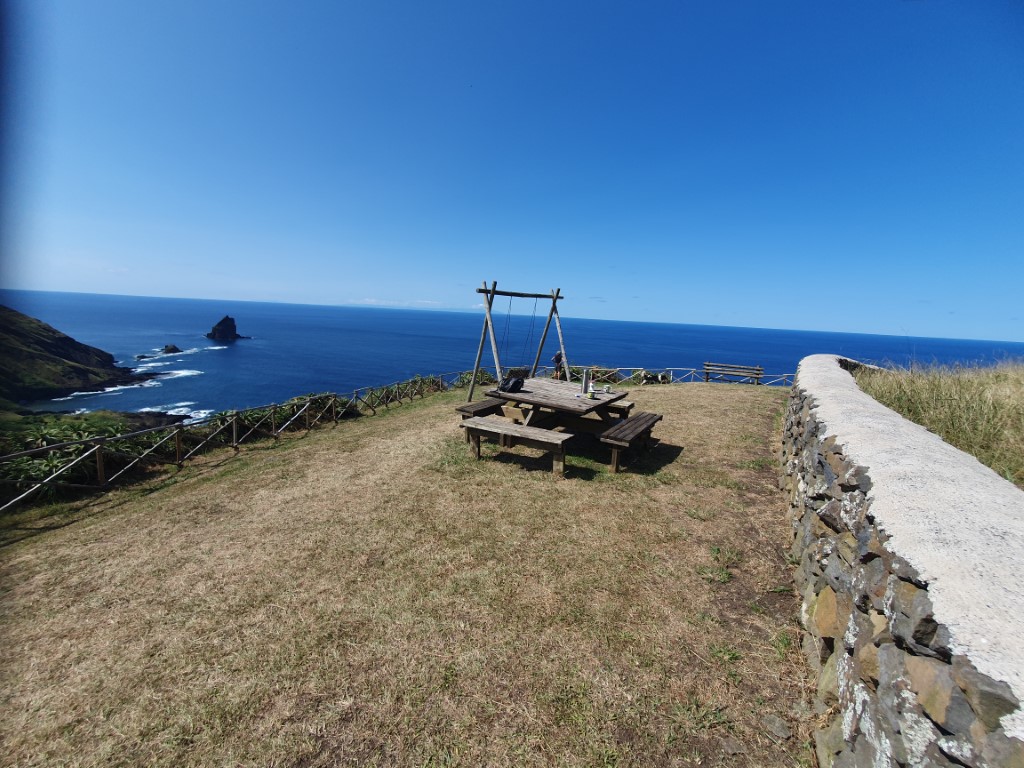 Unsere Tour führt uns zu einer Landspitze mit Picknick-Platz und (!!) Schaukel. Herry ist vor gefahren und hat aufgetischt! Wahnsinn. Ein Super-Ausblick auf Küste, Meer und Sao Miguel.