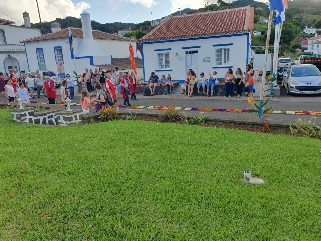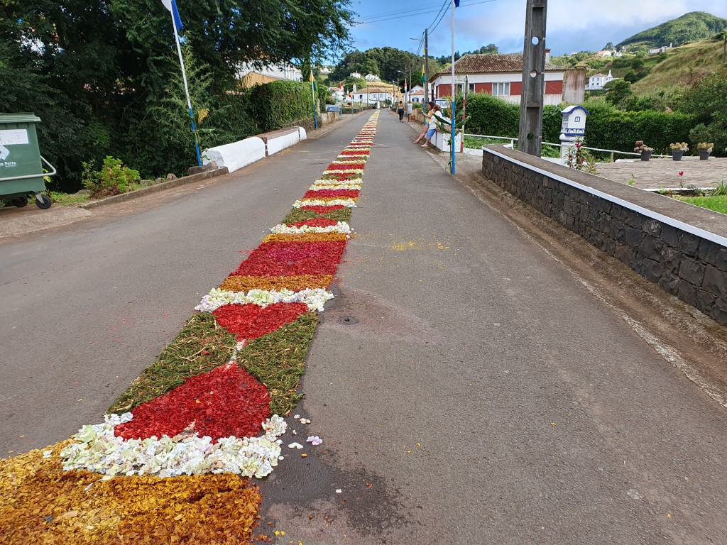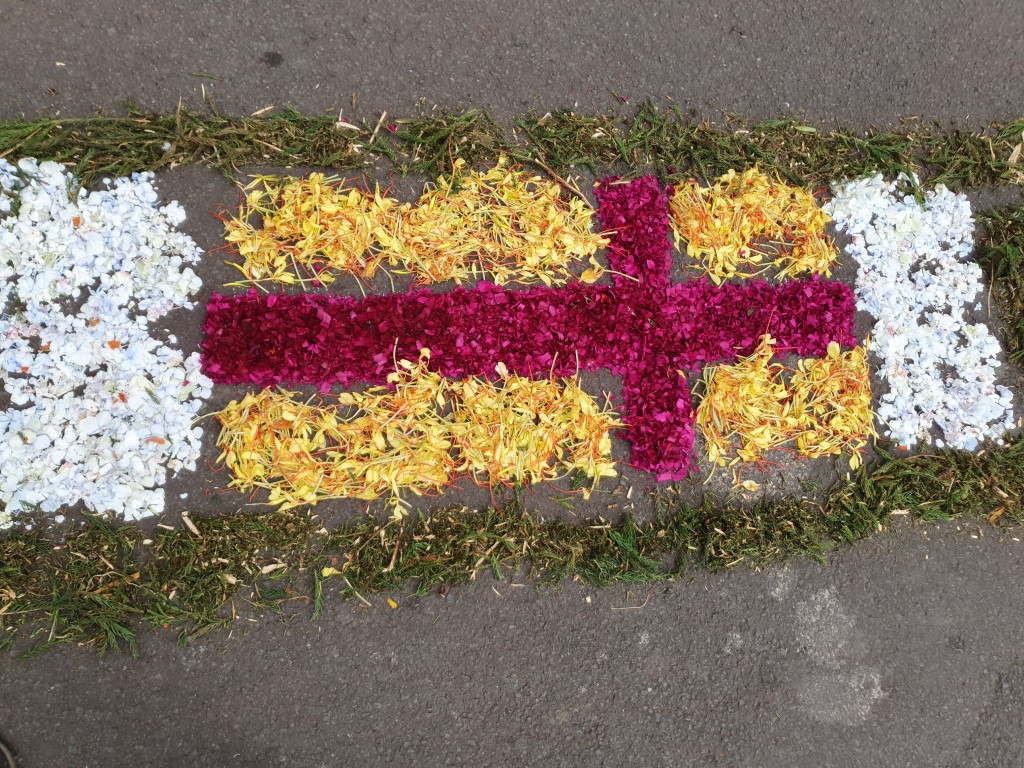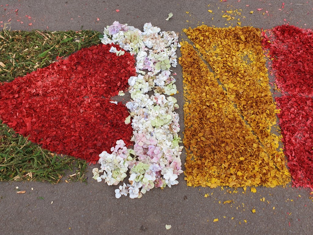 Schon auf dem Hinweg bin ich begeistert: Die haben die ganze Stadt mit Blüten ausgelegt. Aber nicht einfach nur Blüten auf die Straße gelegt, nein, wunderschöne Muster. Herzen und Kreuze, mit Nadelgrün umgrenzt. Die Bilder zeigen das wohl ganz gut.