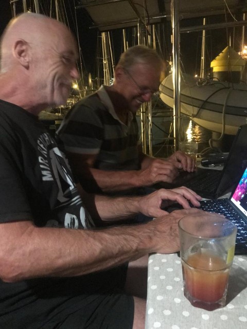 Dann können wir endlich in Ruhe zum wesentlichen Teil des Abends kommen: Derk möchte sehen, wie ich auf See "Wetter mache". Also: Wie geht das mit einer Mail Grip-Daten zu bekommen und wie schaue ich mir dann die Grip-Daten an. So hacken wir auf unseren Rechnern rum, vergessen aber auch zwischendurch unsere Cocktails nicht.