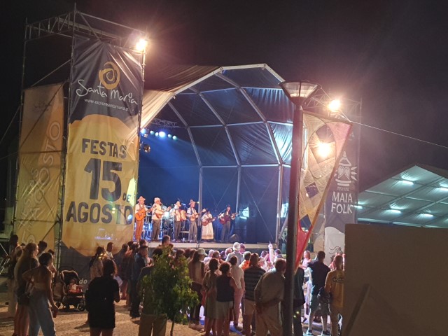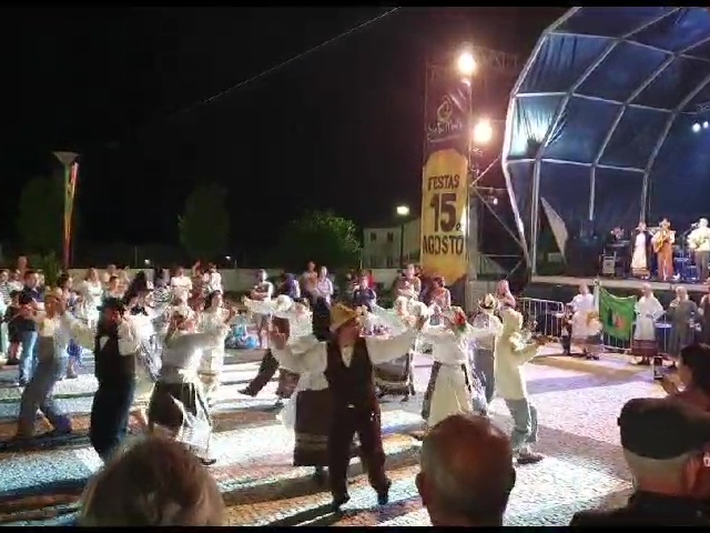 Inzwischen fängt eine Folklore-Gruppe auf dem Platz vor der Bühne an zu tanzen. Sie haben 7 Musiker auf der Bühne und verbreiten viel Spaß! Dabei muss ich dann an mein Referendariat denken. Uwe hat mit uns Squaredance gemacht. Auch wir hatten damals viel Spaß! Meine Gedanken schweifen ab: Ich hab viel gemacht im Leben. Da bin ich gerade im Rückblick ganz zufrieden! Auch Spaß am Tanzen gehört dazu! Zum Abschluss geht die Folklore-Gruppe auf die Zuschauer los. Jedes Mitglied greift sich jemanden von den Zuschauern. Und manche Paare kommen dann auch noch ohne „Profi“ in den Kreis. Drei, vier, fünf Tänze werden nun gemacht, bald 100 Leute sind in Bewegung. Hier ist wirklich Freude angesagt. Ich habe den schweren Einkauf im Rucksack , da kann ich nicht mitmachen. Aber auch wir Zuschauer haben ne Menge Spaß!