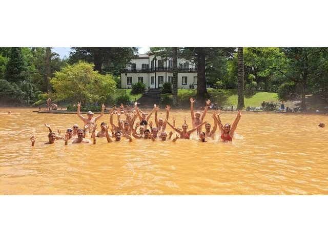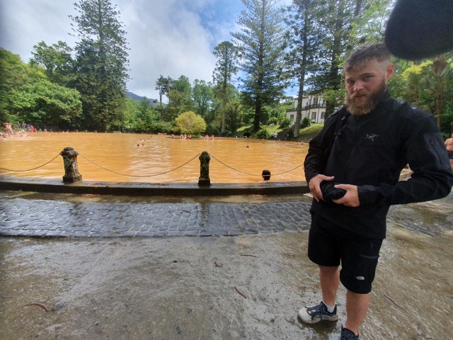 Furnas hatten wir schon beim letzten Sao Miguel-Aufenthalt besucht. Doch durch den Park „Terra Nostra“ sind wir nicht gegangen. Heftiger Eintritt und genügend andere Tagespunkte hatten uns damals abgehalten. Heute und in der Gruppe bekommen wir den Eintritt ermäßigt. Und so wandern wir durch den Park und springen anschließend in das Thermalbad. Herrlich warm. Und schwefelig. Und ganz viel Eisen in dem Wasser. Undurchsichtig rot-braun. In eineinhalb Meter Tiefe schon dunkel! Und wem es zu warm wurde, der hob den Kopf aus dem Wasser und ließ den kühlen Regen auf sein Haupt prasseln. Zeitlich passte es, noch einen kleinen Snack zu sich zu nehmen. Und in dem Cafè, das wir aussuchen, saßen da wieder eine Menge unserer Gruppe. Und dann kam die Nachricht: Abfahrt eine Stunde nach hinten verschoben, Wetter bessert sich vielleicht später!