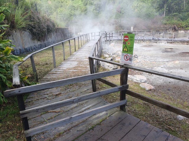 Um 15 Uhr dann das nächste Briefing: Wir fahren noch hoch an den See. Ja – hoch zum See! Das ist der wassergefüllte Krater. Am Rand eine Stelle, die sehr heiß ist. Dort garen eine Menge Restaurants ihren Eintopf. Aber man kann auch für eine private Feier einen Topf in die Röhren stellen. Dann kommt ein Holzdeckel drauf und alles wird mit Vulkan-Erde bedeckt. 6 Stunden später ist es gar! Natürlich ist es nicht ganz so einfach, wird uns erklärt. Man muss schon wissen, wie man die Zutaten schichtet und wie viel Wasser dazu gegeben wird, dass es gar, aber nicht zerkocht ist, so wird uns erklärt.