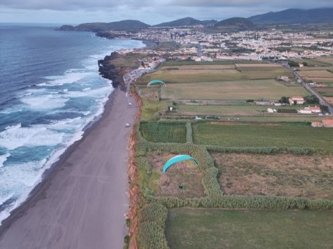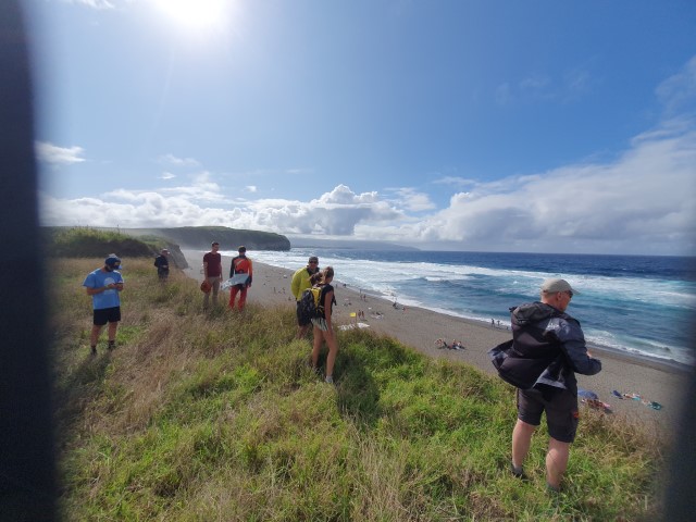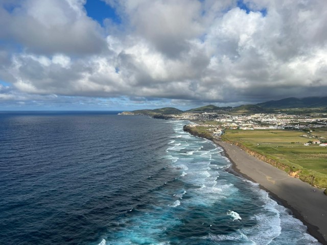 Dann geht es zurück an Ribera Grande. Mit einem kleinen Schlenker nach Santa Barbara. Dort ist eine Steilküste, an der man (gut?) soaren kann. Doch der Platz ist begrenzt, die salzige Seeluft tut dem Schirm nicht gut und man soll um Gottes Willen doch toplanden, um nicht unten am Strand in irgendwelche Badegäste einzubomben. Und man soll nicht zu lange fliegen, damit die nächsten starten können. Denn 3 bis 5 Schirme in der Luft bedürfen schon vorsichtigen Fliegens. Solchermaßen belehrt schauen wir uns alle erst mal den Startplatz an. Ein local hat einen kleinen Leichtschirm, startet aber nicht, denn es ist auf dem Meer eine Regenböe zu erkennen, die auf uns zu zieht. Ich schaue mir das Ganze an und entscheide: Not me! Nicht heute. Verkünde, dass ich lieber ein Bier trinken gehe, als mich vom Regenschauer durchnässen zu lassen. Das ist für manchen ein schlagendes Argument. So trifft sich nach einer Weile ein Großteil der Gruppe an der Strandpromenade mit Bier oder Eis in der Hand. Der Regenschauer ist schnell durch und wirklich starten zwei, drei Schirme. Einer aus unserer Gruppe auch. Und einer startet von unten. Ja – das sieht so aus, als könnte ich mir das auch zutrauen. Also, wenn wir mal den ganzen Tag hier sind, dann denke ich, dass ich auch in die Luft kommen werde. Aber für heute bin ich sehr zufrieden mit meiner Entscheidung, es gar nicht zu probieren. >
