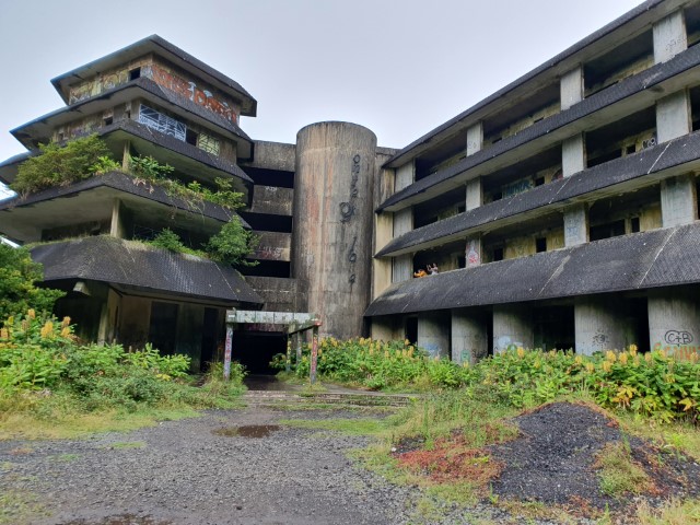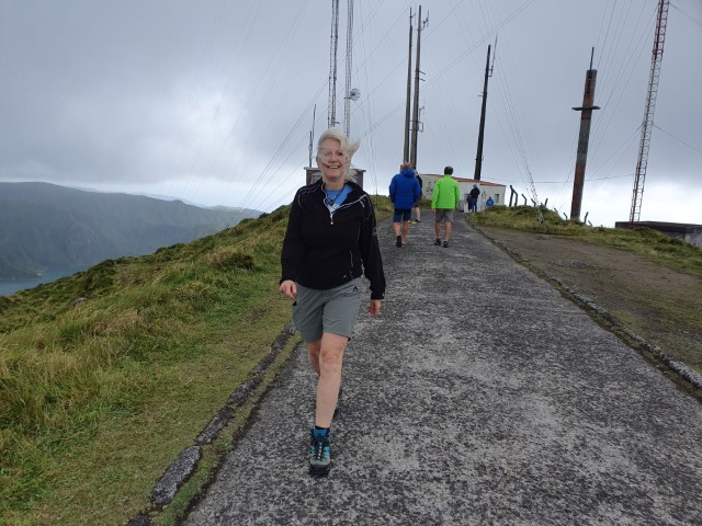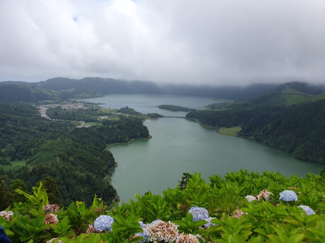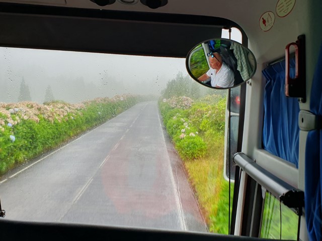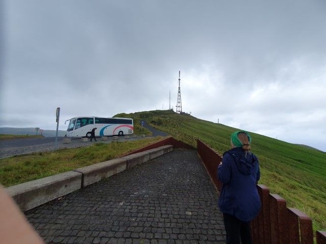 Dann geht es nach Westen: Sete Cidade ist das nächste Ziel. Da waren wir letztes Jahr schon mal. Heute etwas fauler: Wir fahren mit dem Bus an den höchsten Punkt, zur einen Seite der Atlantik, zur anderen die beiden Seen: Der Grüne und der Blaue. Heute sind beide nur grau. Aber für mich ein Highlight. Wir schauen uns die Hotel-Ruine von innen an. Es war ja als Luxus-Investition gedacht. Nur: An 200 Tagen im Jahr sieht man weder den Atlantik noch die beiden Seen. Sondern nur Nebel!