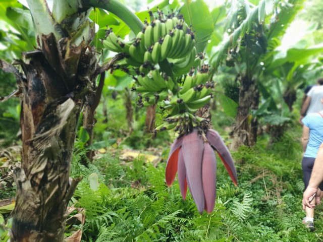 Zur Erbauung einiger schleppen wir uns dann noch durch sein Bananenfeld. Und bekommen am Ende wunderbare Bananen, frisch geerntet. Auch die Ananas ganz reif und frisch ist ein Genuss!