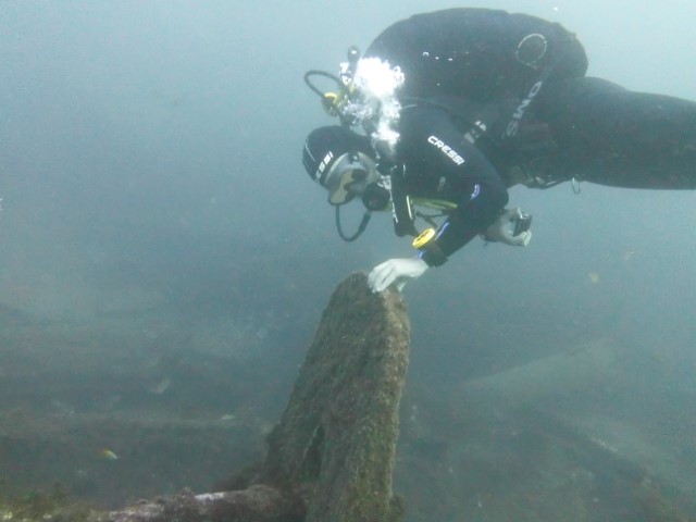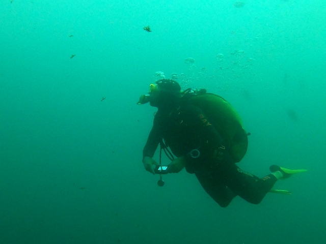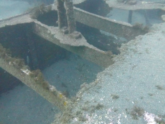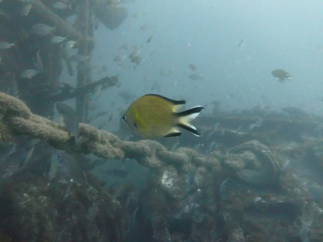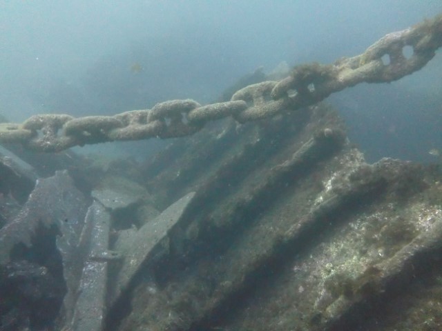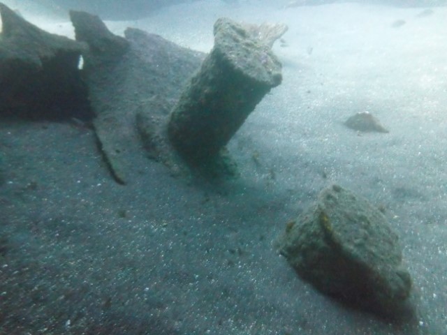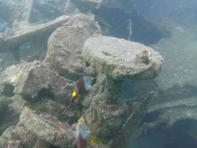 Abtauchen, Grund auf ca. 18 m. Sicht ist schlecht, aber am Rande des Sichtfeldes ist es etwas dunkler: Das muss das Wrack sein. Ein 140 m langer Frachter, vor 60 Jahren durfte er nicht in den Hafen einlaufen, da sie Angst hatten, dass er ihnen im Hafen absäuft. Und so liegt er nun kurz vor der Hafeneinfahrt und ist ein Paradies für Fische und Taucher. Manche Teile sind noch gut erhalten, man hat eine Menge zu sehen und einen netten Dreiviertel-Stunden-Tauchgang. Die Bilder mögen für sich sprechen, den Film hat Lukas gemacht.