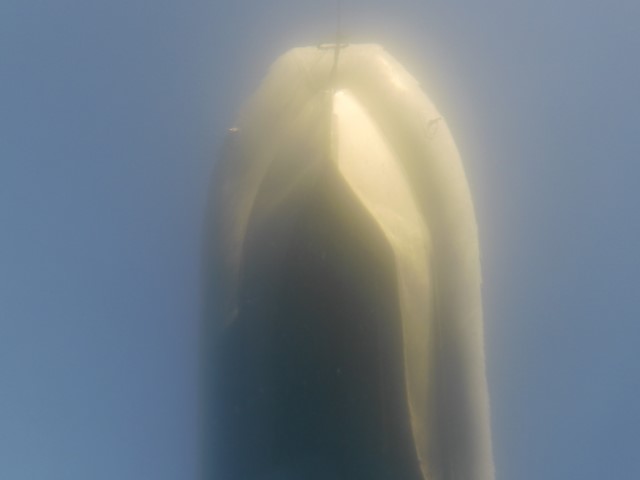 Letzten Einkauf, Lukas an Bord nehmen, Boot seeklar machen, bei der Immigration und dem GNR abmelden. Da ist das Restaurant mit den netten Cappuccini. Haben wir natürlich noch einen bekommen. Und dann auslaufen, die Boje vom Wrack suchen und außerhalb der Verbotszone ankern. Inzwischen ist es bald 17 Uhr und wir machen uns tauchklar. Im Dinghy zur Boje – die ist inzwischen frei, die letzte Taucherschule hat Feierabend gemacht.