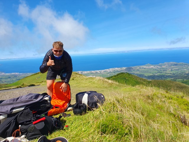 Wir verlegen morgens schnell vor den Hafen von Vila Franca und machen uns langsam fertig. Mit den großen Gleitschirm-Säcken ins Dinghy, das ist dann voll! Ab in die Marina und an Land. Taxis gibt es am Hafen nicht. Und auch in der Stadtmitte an einem schön baumbestandenen Platz: Keine! Also setze ich mich mit unseren Sackelns auf eine Bank und Lukas zieht los, ein Taxi zu fangen. Nach einer Viertelstunde kommt er zurück: Auch an der Zentrale stehen keine!