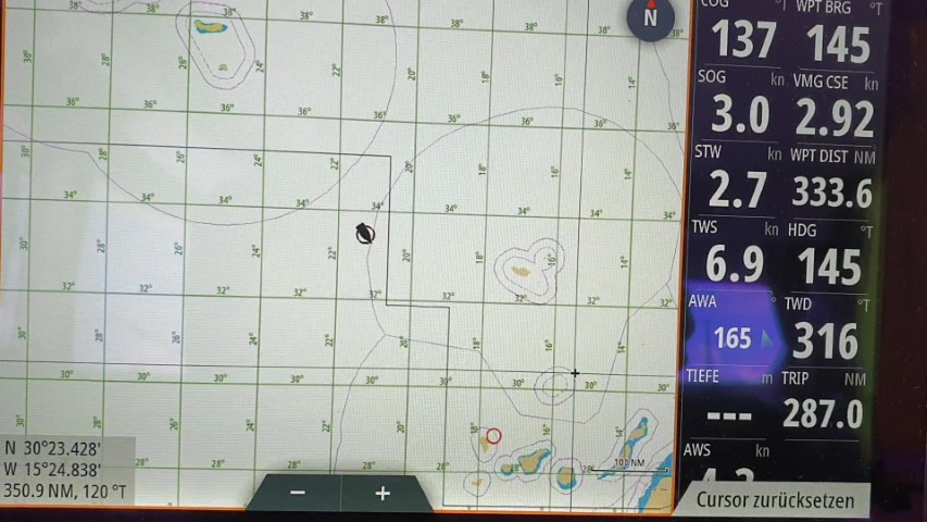 Mittagsposition: 33°36.8'N 21°24.0'W Etmal: 59,7 sm.