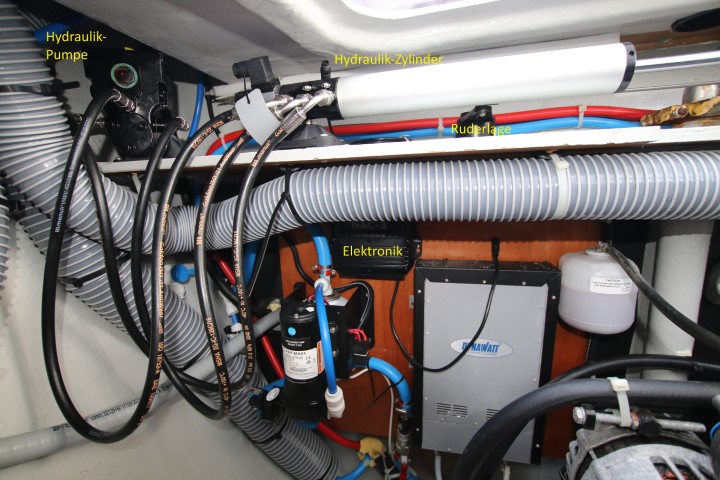 Heute mache ich erst mal „Mechanik“. Also die Teile einbauen. Verkabelung kommt dann später. Hydraulik-Zylinder mit den Schläuchen zur Hydraulik-Einheit. Die muss genau waagerecht eingebaut werden. Darf nicht senkrecht an die Wand gebaut werden. Aber ich finde einen Platz. Ruderlagen-Geber muss genau auf das Ruder ausgerichtet werden. Die Elektronik-Box, die muss nun senkrecht eingebaut werden. Auch dafür finde ich einen Platz. Jetzt fehlen noch die Kompass-Einheit mit den Beschleunigungssensoren. Sie soll möglichst schiffsmittig eingebaut werden. Da ist dann die verfügbare Netzwerk-Kabellänge begrenzend. Also – das mach ich dann morgen: Esrt mal schauen, wie weit ich mit dem Kabel komme. Ein weiteres soll zum Steuerstand gezogen werden. Auch dieser Weg ist lang! Das geht ja nicht „in Luftlinie“.