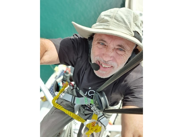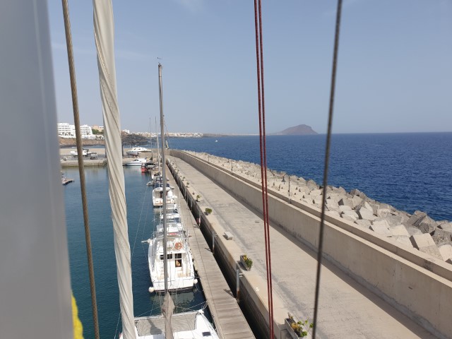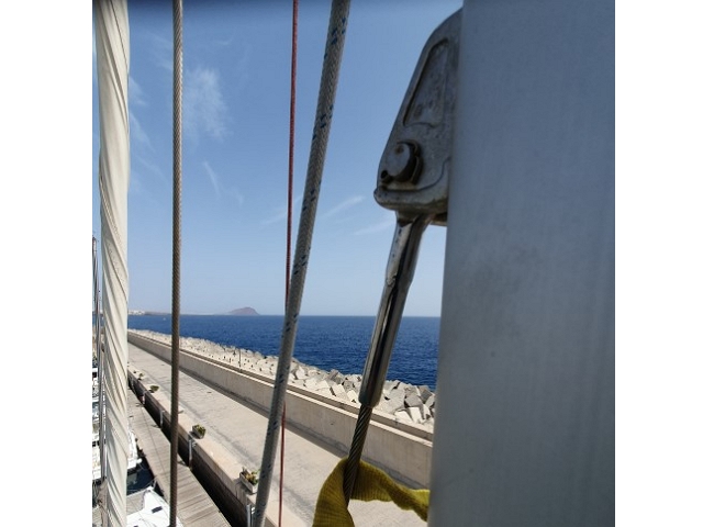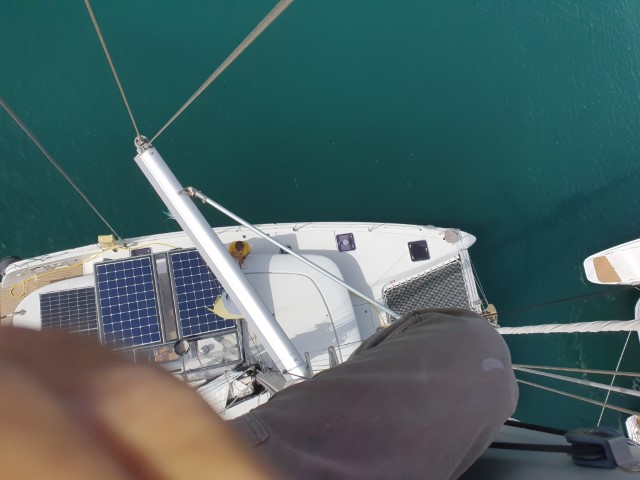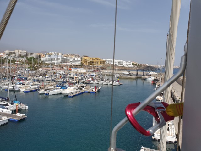 Dann steht ein schon lange immer wieder verschobenes Projekt an: Mast-Begehung. Alleine mochte ich das nicht. Vor Anker war es mir zu schaukelig. Und nachher sind wir wieder vor Anker. Also muss es jetzt sein. Michèle muss sichern, ich steige bis in den Top. Da bekommt RE den oberen Teil mit Hoch-Reflex-Band in Orange getaped. Das reflektiert in der Dunkelheit wirklich enorm. Dann wird ein rostiger Splint ersetzt und alle Terminals (Übergänge der Seile, die den Mast halten in den selben) werden ausgiebig geputzt. Flugrost ist egal, aber man kann da nicht unterscheiden, ob ein kleiner Riss rausrostet oder es eben nur Flugrost ist. Also muss alles schön glänzen! Alle Verbindungen, Schäkel, Terminals, Rollen, Splinte, die UKW-Antenne, die Lichter werden gecheckt. Alles gut – so können wir über den Atlantik gehen. Und für die nächste Mastbesteigung wird eine neue To-Do-Liste angelegt.