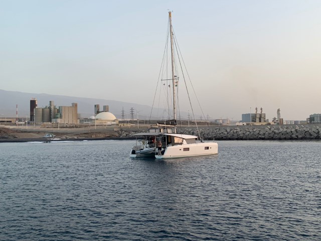 Ok – die Gluthitze der letzten Tage ist es nicht mehr, aber 34° sind schon noch heftig. Und in der prallen Sonne macht Michèle eine „Wanderung“ zum nächsten Supermarkt. Fast 8 Kilometer hin. Unbekannte Wege. Maps ist auch keine große Hilfe für Fußgänger. Mancher gute Weg ist innerhalb von „Firmengelände“. Leider mag sie nicht selbst berichten. Ich kann nur unvollständig wiedergeben, was sie so alles erlebt hat. An einer „rostigen Satellitenschüssel“ ist sie vorbei. Im Nachhinein finden wir heraus, das war mal eine Anlage zur Energieerzeugung. Sonnenlicht wurde auf einen zentralen Punkt fokussiert. Dort wurde ein Überträgermedium (Natrium?) sehr hoch erhitzt und dann zu einem Dampf-Generator geleitet. Nun – heutzutage macht man das mit Solar-Panelen. Und das inzwischen wesentlich effektiver: Im Labor haben sie inzwischen unglaubliche 36% Wirkungsgrad erreicht! Dann auch noch an einem großen Solar-Feld vorbei. Ein Fahrer, den sie anhielt erklärte ihr: Auf Tenerife gibt es nichts Verbotenes. Einfach machen: Sie wollte eine gesperrte Straße lang. Hat dann auch gut funktioniert. Nach Stunden kam sie dann wieder – und sprang auf die Mauer und um den Zaun, der den Hafen begrenzt (Verbotenes gibt es nicht…)! So konnte ich sie auch wieder am Anleger abholen, an dem ich sie rausgesetzt hatte.