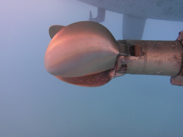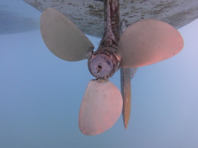 Vorm Ankeraufgehen will ich noch die Propeller fertig putzen. Wird aber nichts. Den Steuerbord-Prop bekomme ich gut hin. Aber auch noch nicht fertig. Dann ist meine Flasche leer geatmet und ich beende die Arbeiten für heute. Nächste Mal ankern, dann wird es fertig gemacht. Nun blitz er schon fast wieder wie neu.