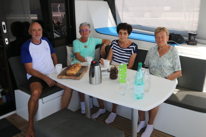 Und die YLs (Funkersprache: Young Ladies) kommen schon mehr als pünktlich. Wir sind gerade fertig. Keine Pause… Aber ein sehr netter Nachmittag. Viele Fragen, was das Leben auf dem Wasser angeht. Und dann natürlich auch viele Stories aus Dahl für Michèle. Nach fast 4 Stunden zieht es sie dann zum Abendessen zurück ins Hotel. Doch: Es ist unglaublich schwer, ein Taxi zu bekommen! Das Marina-Office hat natürlich längst zu. Und Frau Google gibt uns lokale Taxis, aber keine Telefonnummer. Und die mit Telefonnummer sagen ab: Zu weite Anfahrt. Doch als ich mit einer weiteren Telefonnummer wieder bei der selben Dame lande, erbarmt sie sich und gibt mir eine Nummer eines lokalen Unternehmens. Und der ist dann in Minuten da! Tschüss an Annet, Agnie und Bertha, war ein sehr netter Besuch!