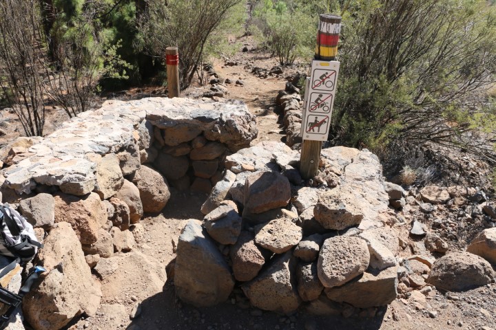 Toll finde ich, wie die Tenerifes ihre Verbote durchsetzen: Mountainbike und Pferde sind auf den reinen Wanderwegen nicht erlaubt. Und damit das auch klappt, haben sie Eingangsschikanen gemauert, die man als Wanderer schnell durchschreitet, die aber für Pferde und Biker sehr unangenehm sind. (Siehe Bild!)