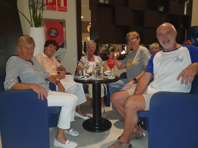 Wir sind mit „den Tanten“ verabredet. Die sind ja regelmäßig um 20:30 Uhr in der Bar. Cocktails trinken. Machen wir mit… Heute große Verabschiedung, morgen reisen sie heim! Und gegen Mitternacht sind wir dann wieder auf RE.