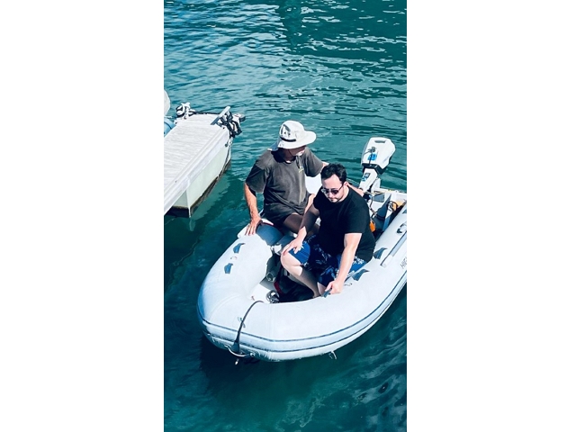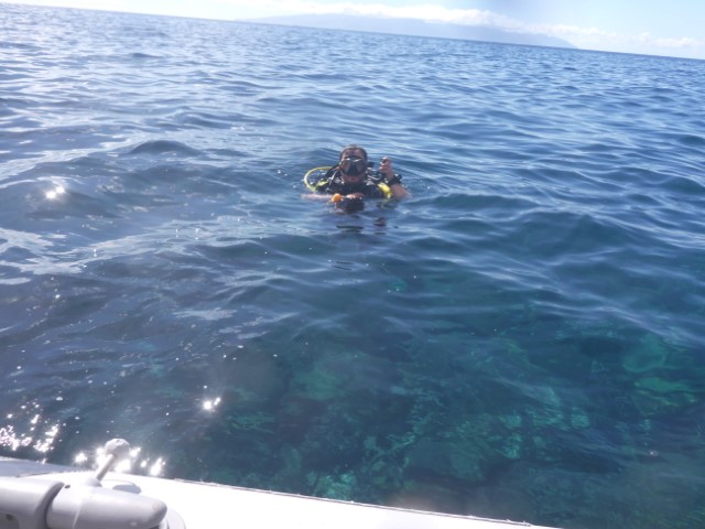 Wir gehen erst mal auf RE – große Besichtigungsrunde für ihn. Ist ja sein erster Besuch. Und dann machen wir die Geräte und uns klar. Klar, dass das dauert. Wir sind ja noch kein eingespieltes Team. Doch dann sitzen wir im Schlauchboot und fahren an „die Wand“. Michèle hatte in den letzten Tagen ein Taucherboot beobachtet. Wir nehmen natürlich die gleiche Stelle. Doch – ein Gerät „pfeift ab“. Am Ende finde ich den Defekt: Ein Verbindungsstück ist nicht fest. Kein Werkzeug im Schlauchboot. Da nehme ich dieses Gerät. Handwarm angedreht geht es… Nun ist es so weit: Ab ins Wasser.