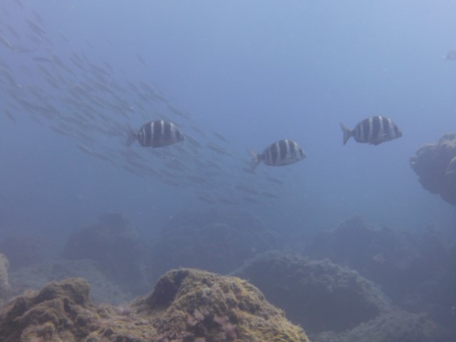 Gut – ein besonderer Tauchspot ist es nicht. Aber die üblichen Verdächtigen sind da. Was man halt im Atlantik an jeder Küste so findet. Besonders sind heute mehrere stationäre Fischschwärme. Das hab ich so auch noch nicht erlebt. Sind wohl Spanier – und machen gerade Siesta. Wenn man mitten rein schwimmt, dann gehen sie schon so ein wenig auf die Seite. Aber sonst hatte ich immer nur vorbei ziehende Schwärme. Wir fotografieren wie die Wilden. Da muss hinterher wieder eine Menge aussortiert werden.