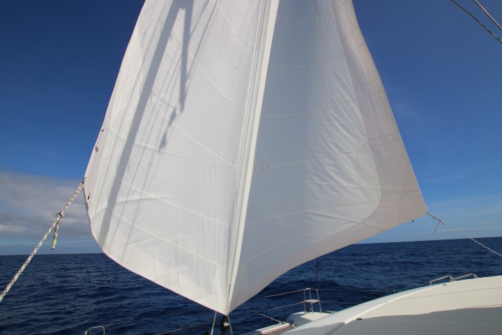 Dann gibt es Bier und selbst gebackenes Brot für die Beiden und eine Runde schwatzen. Irgendwann entschließt sich Johanna zum Aufbruch: Sie muss noch packen und letzte Dinge erledigen, denn MORGEN geht’s dann nach D. Thomas und ich machen uns an die Vorsegel. Er ist unzufrieden, hat er doch eine Keder mit 4,5 mm bestellt. Geliefert und Grund für meine Reklamation war, dass sie aber eine 3,5 mm Keder eingenäht haben. Damit besteht die Gefahr, dass das Vorließ aus der Schiene gezogen wird bei starkem Wind. Thomas diskutiert einige Ideen und wir kommen auf eine recht ansprechende Lösung. Nebenbei lerne ich wieder viel über Segel… Dann die neuen runter, einpacken. Auch hier lerne ich wieder, hatten Michèle und ich doch arge Probleme beim Einpacken des alten. Zu zweit schaffen wir die dann an Land, Thomas wird die Keder verdicken und Sicherungsschlaufen annähen. Die alte Fock wieder gesetzt und dann geht es bald auch aus dem Hafen. Wieder in die Bucht vor Playa de Guancha. Die haben wir für die Nacht allein für uns! Und so wird es ein ruhiger Abend.